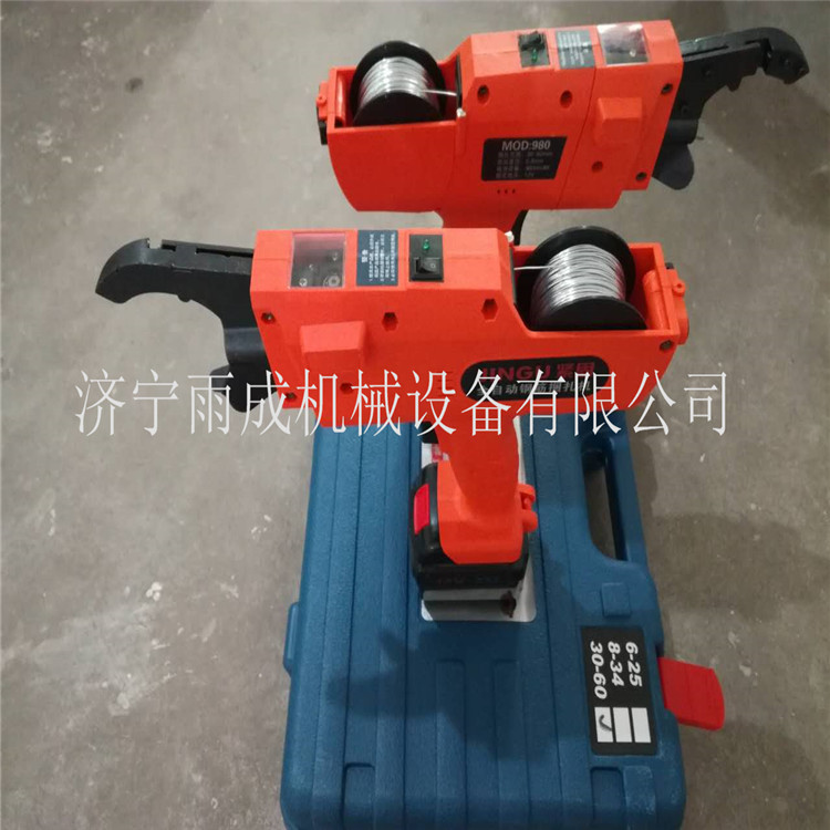 小小钢筋手里拿,只要钢筋就能用到他,不怕风来,不怕雨,就怕买不到。雨成钢筋捆扎机简介钢筋捆扎机,又名全自动钢筋捆扎机,是一种手持式电池类钢筋快速捆扎工具。它是一种智能化工具,内置微控制器,能自动完成钢筋捆扎所有步骤,可广泛应用于建筑工程领域,以代替人工捆扎钢筋。钢筋捆扎机主要由机体,专用线盘,电池盒,充电器四部分组成。雨成钢筋捆扎机特点1.操作简单,单手操作,提高了工人操作的安全系数。2.捆扎速度快捆扎速度是人力操作的3-4倍,每个结的捆扎时间为1秒,大大减轻了工人的劳动强度。3.重量轻、外观精巧整机重量只有2.5 kg,操作方便。4.强劲的锂电池,充电时间70-80分钟,每次充电可以连续捆扎1300-1500个结,使机器方便携带工作。 雨成钢筋捆扎机参数: 整机寸:270mm*65mm*230mm电池容量:1500毫安时电池电压:10.8V出丝长度:300-650mm重 量:0.98KG捆扎范围:8-34mm铁丝直径:0.8mm