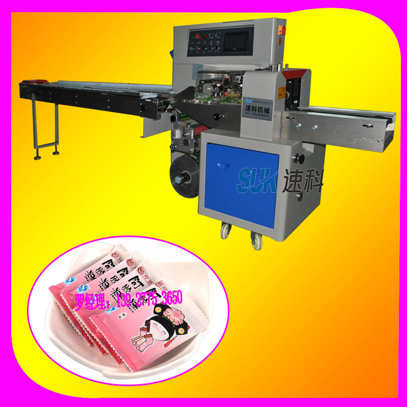 佛山速科包装机专业雪糕包装机 食品枕式分装机 全自动打包装机选速科厂家直销 一、主要性能结构和特点 1、双变频器控制,袋长即设即切,无需调节空走,人性化操作自动提示,省时省膜; 2、主控电路采用进口单片机,人机界面,变频控制,参数设定方便快捷,操作集中直观,充分实现人性化自动操作控制; 3、数字化故障自诊功能,故障诊断一目了然; 4、包装速度和成袋长度采用双变频控制,数字化封切位置输入,封切位置精准、美观、牢固; 5、高感光电眼自动准确跟踪; 6、定位停机功能,不粘刀、不切料、不浪费包膜; 7、双变频简约机械结构,磨损少、易维护、寿命长; 8、各封口温度独立,PID控制适合各种包装材料; 9、带自动正反转特大理糖盘,使空包率达到优秀效果。 二、适用范围 糖果、烟嘴、红枣等 三、选配装置 1、打码机 2、直纹中封轮 3、网纹端封模 咨询热线 罗经理: 139 2775 3650 四、技术参数Technical parameters 机型Type SK-250T 薄膜宽度 Film width Max.250mm 制袋长度 Bag length 45-90mm 制袋宽度 Bag width 20~80mm 产品高度 Product height 10-35mm 膜卷直径 Film roll diameter Max. 320mm 包装速度 Packaging rate 100-300包/分 电源规格 Power 220V/380V 机器尺寸 Machine size (L)4680×(W)670×(H)1450mm 机器重量 Machine weight 980Kg 备 注 Remarks 可加充气装置(Optional air filling device)