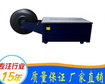 名 称: 低台捆扎机 产品说明: 主要用于商业、邮政、铁路、银行、食品、医药、书刊、发行等行业的纸箱、木箱、纸包件、柳编箱、布包件的包装捆扎。在插入包装带后,机器能自动完成聚带、百叶窗、热合、切断并出带、且装有自动停机之功能。工作速度快、效率高、省时省力、打包质量高。 技术参数: 型号 MNK-A-6 额定功率 220V 250W 捆扎速度 2.5s/turn 适用带宽度 6-15mm 重量 70kg 外形尺寸(长*宽*高) 1450*580*505mm