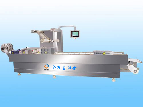 诸城市金康自动化设备厂,是专业生产全自动食品拉伸膜真空包装机的厂家。此次给大家推荐的这台设备是拉伸膜硬盒包装机,硬盒包装机包出来的产品更佳精美、大方。先通过成型做出客户需求产品的硬盒,再通过封口来进行抽真空或者是充氮气,还可以根据客户的需求配备打码机和喷码机,实现了一体自动化。客户只需要通过我们的控制显示屏就可以全部操作。真正实现了简单化,自动化。若有其他问题可直接与我司电联! II.全自动真空包装机主要功能 A. 光电后续:颜色覆盖膜或光学膜可用于包装,从而可降低成本和提高产品美观性; B. 采用模块化的模具,他们可以很容易地更换,并且可以在多台设备上使用.该模具有一个冷却系统; C. 用于产品包装,氮或其它保护性气体,可根据用户的要求抽真空之后可以被填充到包装内; D. 根据用于产品包装的用户的要求,机器可以用自动打码打印所需内容,或者是使用自动喷码.; E. 德国普旭泵使用在设备上,保证了设备的稳定的质量和良好的耐用性; F. 采用高品质的广开式链条,本机适用于拉伸成型和软膜,硬膜及不同厚度的半硬质薄膜的特殊包装; G. 本机具有先进的冲压横向和纵向切割,可根据用户的要求切割,是您更换和操作简便的优选择; H. 装有废料回收系统,以维持良好的环境,和人类健康的负责. 山东省诸城市金康自动化设备厂,专业生产拉伸膜包装机,意向客户可直接与我司联系详谈,金康自动化非常欢迎各位客户的参观考察.