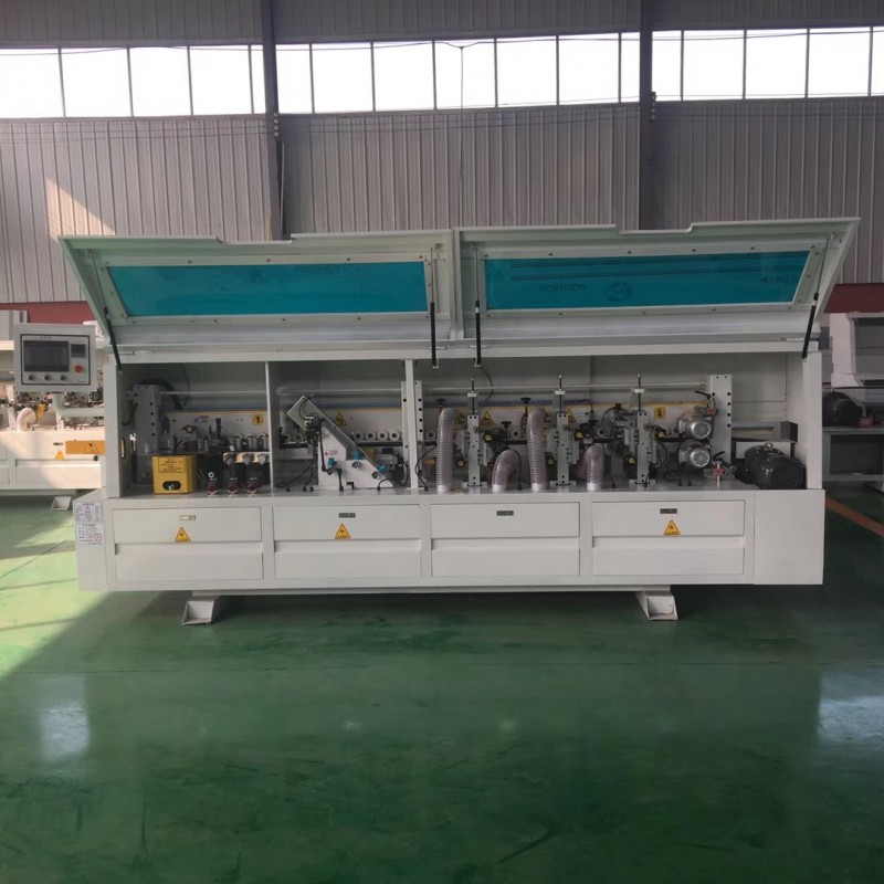 常见的自动直线封边机主要由预热、贴边、前后齐头、上下修边、上下抛光等组成。预热:将板材在涂胶之前加热的一种功能,目的是为了涂胶后与封边带粘贴的更加牢固。贴边:将封边带粘贴到板材上并压紧。齐头:切掉贴边后板材前后多余的封边带,使封边带与板材端面平整。修边:修边是包括了粗修、精修、仿形修边及刮边在内的一种功能,作用是把 板材周边高出板面部分的封边带修出圆弧,让板材边缘光滑过度,使之达到美化作用。抛光:利用软性材质抛光布轮将工作面抛出光泽,以达到更佳的效果。