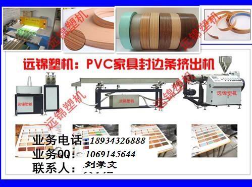 PVC封边条挤出生产线的适用材料:PVC料 PVC封边条特点: 具有附着力好、修边与面色相同、具有抗氧化、防紫外线等效果,耐黄变、耐油污、耐磨、环保、批次间无色差等特点 PVC封边条挤出生产线机器组成和特点: 1.主机: SJ55主机采用PVC料专用高精度镀硬铬镜面处理的合金螺杆,电机用采用变频调速,高精度智能温控表,温控精度达到±1度,挤出机专用硬齿面大推力减速机,塑化效果好,运行稳定,故障率低 2.模具: 模头采用S-136H热稳定镜面钢,流道短,无死角,生产的密封条成型时表面靓,无黑点等缺陷,外形尺寸精确。 3.冷却水槽: 不锈钢冷却水槽,三维调节式机架,操作方便,外观简洁美观 4、牵引压花机:牵引部分,牵引轮采用PU胶轮,牵引力强,耐磨。变频调速,牵引速度0—60米/分钟无级可调,牵引速度平稳。压花部分:压花轮表面硬化处理,耐用,花纹清晰。并附带上胶轮,可给封边条下面涂UV胶。 5、收卷机:单工位家具封边条专用收卷机,力矩电机驱,收卷张力可调,操作方便,取盘快捷简单。