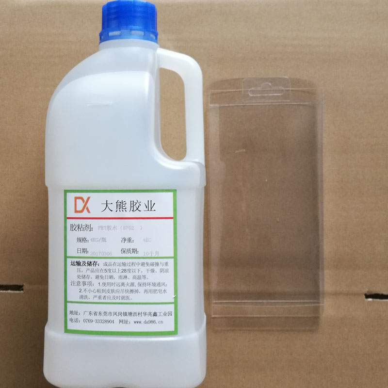 包装材料低白APET胶水 大熊牌APET胶水,APET包装盒机器粘接胶水,通用于APET、PET、PETG等环保料胶盒,圆筒等外包装产品机器糊口粘接,APET胶盒环保胶水具有粘的牢,低白化,不易燃易爆,方便运输和存储。 环保胶盒APET胶水还可以用于 PET 、 PETG 、 APET等材料的收缩膜合掌机器糊口粘接,粘接时主要是APET胶片或者薄膜接口处固定的涂上很薄的一层环保APET胶水,然后经过机器自动快速压合,糊合来达到粘接的效果,通常都是粘接面趆小,涂胶后合压趆快粘接出来的胶盒胶边趆好,趆达到低白化或者不白效果。 环保胶盒APET胶水的特点: 1 、不粘手,干化快,使用方便。 2 、溶接型粘合,抗拉力强,达到粘接的要求。 3 、粘合后稳定性好,不老化。 4 、环保,通过 ROHS 捡测。