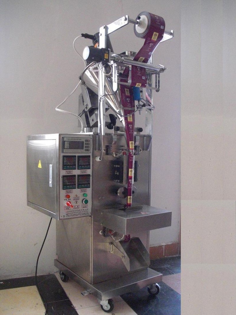 DXDF60Z粉类全自动包装机 主要特点 1、制袋系统采用步进电机细分技术,制袋精度高,误差小于1毫米。 2、控制器汉字显示。 3、热封器四路加热控制,双侧各封道可单独调温;热平衡良好,保证封口质量,适用于多种包装材料。 4、智能型光电色标定位控制系统。 5、可视性良好的侧开式防护挡板,操作安全。 6、计量螺杆由步进电机驱动可获得极高的重复精度。 7、采用新料斗升降装置,360度旋转,便于调整,利于清洗,省去清洗后的再次调整,提高工作效率。 使用范围:粉剂包装机适用包装粘性不大的粉状物如:灵芝粉、奶粉、豆奶粉、壮骨粉、藕粉、调味粉、魔芋粉、葛粉、杏仁粉、大麦粉、中药粉、保健粉、坚果粉、麦片、蛋白质粉、茶叶粉、等粉剂物料的自动包装。 技术参数 型 号 DXDF60Z(旋转切刀) 电源/功率 220V/380V 50HZ 1.75KW 计量范围 1-80ml 制袋尺寸 长50-150mm 宽30-100mm 包装速度 40-60袋/min 机器尺寸 695*770*1640mm 机器重量 200kg 包装材料 各种复合膜材料 包装材料直径 《300mm
