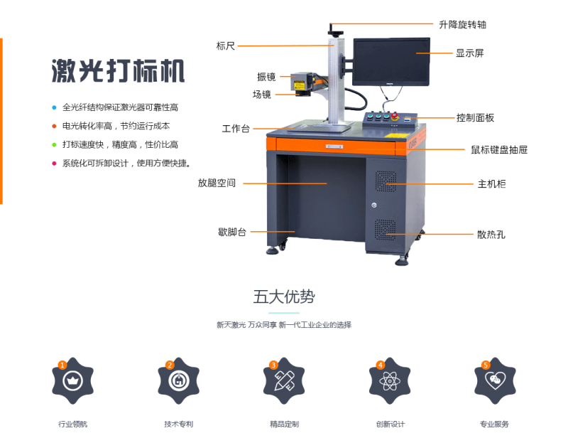 一、???关于我们 济南新天科技有限公司是一家专业致力于工业激光技术应用及激光打标,喷码,焊接,切割设备的研发,生产,销售及售后服务的高新技术企业。? ?? ??公司主要产品包括:二氧化碳激光喷码机,二氧化碳激光打标机,光纤激光打标机,端面泵浦激光打标机,半导体侧泵激光打标机,YAG灯泵浦激光打标机,半导体激光喷码机,激光焊接机,大功率激光切割机 等四大系列二十余种工业激光设备以及YAG激光器,CO2激光器等各种配件。 公司为客户提供一套完整的标识解决方案,产品可以清晰快速的标记出各种各样的图案,LOGO,文字,数字,字符,字母,图形,条形码,生产日期,批号,二维码,序列号等等,用于产品标识,防伪领域。公司还为客户提供一套完整的售前,售中,售后的服务,保证客户的满意。新天激光的服务宗旨:以客户为本,用质量,服务说话,用心沟通,为客户量身定做一套标识解决方案。 二、新天激光打标机优势 我公司激光打标机具有高效率、低维护、易操作、利环保等优势和特点。打标机使用过程中用电更节约、品质更精细。目前公司激光打标机已在全国二十余个省市、地区被客户广泛使用,其中不乏剑南春、五粮液、东风汽车、中国铝业、惠普等大型企业客户。公司依托强大的科研团队,及优秀的研发、技术、销售服务等工程师,可为您提供整套打标方案及配套设备服务。 主要优势详解: 1.?高效率: 新天激光秉承技术创新优势,努力提高打标工作效率,高速机高可标刻4万件产品/小时。 2.?低维护: 采用激光行业质量过硬的高质量元器件,使用过程中维护简单,正常操作使用中几乎不会产生故障。 3.?易操作: 我公司激光打标设备的自动化程度高,只要会电脑,经过简单系统培训,即可掌握设备操作。 4.?利环保: 激光标刻是以非机械式的"光刀"进行加工,对工作表面不产生腐蚀,无"刀具"磨损、无毒害、无污染。 5.?整套方案订制: 我公司可根据客户要求,在任何规则或不规则的表面、任何材质工件上标记,且打标后工件不会产生内应力,保持工件的原有精度和物理化学特征。 三、?CO2激光器 CO2激光器是一种气体激光器,其产生的波长为10.6μm,属于中红外频段,CO2激光器有比较大的功率和比较高的电光转换效率,是目前功率大的一种激光器。二氧化碳激光器以CO2气体作为工作物质,将CO2和其他辅助气体充入放电管,当在电极上加高电压,放电管中产生辉光放电,就可使气体分子释放出激光,将释放的激光能量放大后,就可进行激光加工。?激光机与物品作用的原理是:利用聚焦后激光束在各种不同的物质表面烧烛上永不磨灭的标记。高脉冲能量的CO2激光光束,通过打标和打标软件控制出光和关光,激光通过扩束后再通过平场场镜聚焦,使其光斑更小能量更加集中.打标图案是通过高速扫描振镜的摆动来实现,打标的效应是通过表层物质的蒸发露出表面层物质,有些又或者是通过高能量的脉冲光能导致表层物质的化学变化或者是物理变化而刻出痕迹,又或者是通过光能烧掉部分物质(比如木质材料),显出所需刻蚀的图案、文字。 四、产品简介: XT-CX系列二氧化碳(CO2)激光喷码机是一款专门用于非金属材料上做标记的激光打标设备,系统采用全封闭式的射频CO2优质激光器(金属封装),该系统光束模式好,性能稳定,加配高速数字扫描振镜,可以实现批量打标,连续24小时运行。我司可根据企业用户的使用要求,制作成在线喷码、静态打印、在线和静态打印兼备的不同功能状态。使用企业可根据自身情况,自由选择连接生产线或单独使用。 五、产品特点: l? 可以用于各种非金属产品的激光标记。 l? 打标速度快,效果精细美观,精度高,雕刻深度随意可控。 l? 客户多样化的选择,提供10W,30W,50W及更高功率的设计,款式提供便携式,手提式,台式,桌面式,机柜式等诸多机型。 l? 可以雕刻全部的非金属材料,弥补了半导体,光纤无法标记的一些非金属材料。 l? 标记内容丰富,包括数字,字母,图形,商标LOGO,条形码,二维码,序列号,图片等。 l? 使用寿命长,激光器高可达20000多小时,免维护,无耗材。 l? 自动化程度高,控制软件可以在WINDOWS XP/WIN7下运行,支持中英文系统,能兼容AutoCAD,CorelDraw ,PhotoShop等多种常用制图软件的文件格式,如PLT,DXF,AI,JPEG,BMP等多种格式。可以自动编码,跳号。 l? 整机采用风冷,能适应各种恶劣的工作环境。 六、技术参数: 产品型号 XT-10C XT-30C XT-50C 波????长 ?????????????????? 10.6um 激光功率 10W 30W 50W 激光器类型 金属射频管 标记速度 7000mm/s 标记范围 110mm*110mm(70mm*70mm,150mm*150mm,200mm*200mm可选范围) 频率