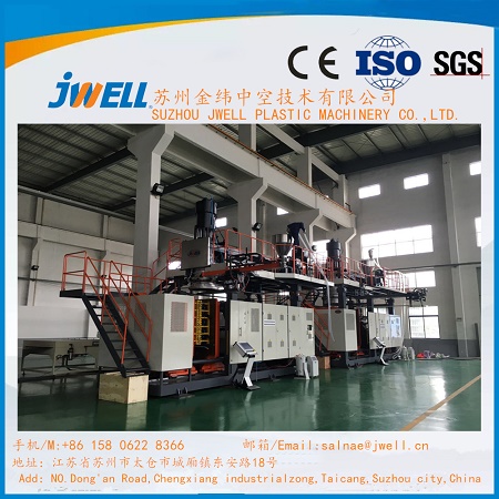 适用于生产各种规格吹塑托盘;路障等 选配下包封封,制品顶出,抽芯等动作元件; 采用高产量挤出系统,储料式模头; 选配液压伺服控制系统; ①投入资金少。用大型挤吹中空成型机生产中空吹塑托盘,一机多用,降低投资成本,且模具成本低,投资少。 ②外形美观。根据制品承重的特点,从力学原理人手,在模具上设计不同排列形式的圆形立柱及不同方向的凹槽,使制品表面带有防滑颗粒,由于使用冷冻水快速冷却,使制品表面平整,有较高的尺寸精度。 ③性能优良。制品经挤出吹胀一次成型,成型过程快速,物料在高融状态快速吹胀冷却定型,可消除内应力,使制品内在质量和性能稳定,符合国家标准要求。 ④安全性好。不助燃、不导电、防滑、无毛刺飞边、无其他辅助连接,可确保货物和作业者的安全。 ⑤寿命长。制品通过添加防老剂可提高户外使用寿命,一般条件下可用5年以上;恶劣环境下可用2年。使用寿命为木托盘的5~7倍、钢托盘的2~3倍。 环保性能好。制品无毒无味,耐酸碱盐的腐蚀,易于清洗消毒,不腐烂,同时废旧托盘可回收利用,符合环保要求。 ⑦运输成本低。托盘质量轻,可大幅度降低集装箱货物运输时的费用,进行对外贸易时,出人境无需像木托盘那样由卫生检疫部门进行熏蒸、消毒等处理。 ⑧维护费用低:塑料托盘不需要修理、保养,即使外表损坏,只要内部的立柱黏结完好,就不影响正常使用。 适应性强。中空吹塑托盘双向四向均可操作 ,又有双面、单面两种形式,可用于各行各业,提高工作效率和空间利用率。 ⑩承载能力强。由于托盘按受力情况合理地进行了结构设计,使得承载能力强,均匀分布的承载能力为:静载荷30~40kN,动载荷20-30kN,架空载荷为IOkN。