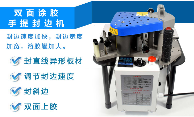 手动送料加上手动控制在配合机动化的滚轮加压方式,可以准确快捷的进行封边工序,各部分工件设计严密严整,无脱胶溢胶现象。 手提封边机精简、轻便、质优、价美 可以直接适用于板式直线与弧形不规则边框封边作业 手提木工封边机安装上固定支架配件时,其使用方式则与传统曲直线手动封边机相仿 手提木工封边机可随意地转换工作场所, 到达装修工地进行现场施工, 适合装修行业使用。由于其 灵活性高,所以对于大型木板的封边更加实用,不需要多人操作,操作起来也方便快捷。 手提封边机同时适用于各种不同材质的封边带:如三聚氰胺纸、木皮、塑料(PVC或AB 手提封边机功能特点 1.封边带的适用宽度范围增加至10mm-60 mm 2.主机供胶系统:供胶轴上下两支点固定,结构稳定,坚固耐用。 3. 特殊胶盆保温设计; 容量加大且预热时间短。 4. 温控器:根据封边带及热溶胶所需的溶胶温度,自动控制温度。 5. 调速器:根据不同涂胶和压带需要调整机器速度。 6. 所有电器配件均达到UL及CSA标准,整机已符合CE认证。