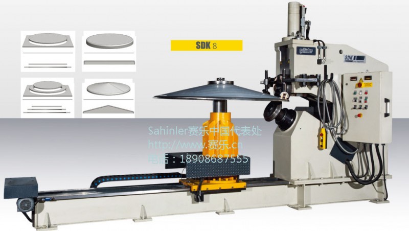 供应sahinler赛乐SDK8圆板切割&旋边机 旋边 切割 3种不同的可选旋边模具 --------------------------------------------------------------------------------------------------------------------- sahinler赛乐SDK8圆板切割&旋边机 技术规格以及标准配置: ? 配有一套旋边轴(R25) ? 配有一套切割刀片 ? 双转速工件托架 ? 顶部和底部的旋边轴由独立的液压马达与行星减速机带动,可以在0,35-0,68 m/min内进行速度调节 ? 可进行平坦型和冠状型的旋边 ? 平坦型和冠状型旋压底部高度是液压可调的 ? 切割和折边都在同一端操作 ---------------------------------------------------------------------------------------------------------------------