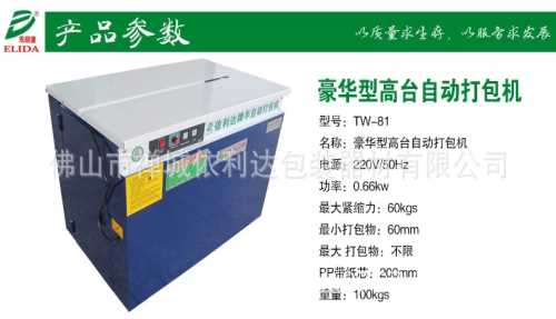 石家庄半自动打包机纸箱捆扎机低价格/昆明自动折盖封箱机纸箱封箱机哪家好/依利达包装器材 台湾依利达国际集团控股有限公司,佛山市禅城依利达包装器材有限公司专业制造各类包装机械,全自动打包机、半自动捆扎机、电动捆包机、PET塑钢带打包机、PET气动打包机、免扣钢带打包机、气动钢带打包机、铁皮捆扎机、全自动薄膜捆扎机、尼龙绳自动捆扎机、草绳结束机、尼龙绳捆绑机、热收缩包装机、袖口式全自动封口包装机、全自动L型封切机、自动整列收缩包装机、自动封箱机、自动开箱机、气动钉箱机、脚踏封底机、自动胶带切割机、色带打码机、电动印码机、手持式喷码机、自动喷码机、 手压封口机、连续薄膜封口机、电磁感应铝箔封口机、热熔胶机、泡壳包装机、泡罩包装机、贴体包装机、吸塑包装封口机、高周波塑料熔接机、高周波塑胶焊接机、高频机、拉伸膜缠绕机、托盘裹包机、枕式包装机、食品包装机、颗粒包装机、粉末包装机、自动折纸机、半自动贴标签机、标签分配器、自动贴标机、易拉罐封罐机、瓶盖锁口机、自动缝包机组、自动流水线封包机、热熔胶机械、液体灌装机、膏体灌装机、重量检测机、缓冲气垫制造机、缓冲气泡袋包装机、真空吸吊搬运设备、电动助力机械手、集装箱运输包装系统、自动打包流水线、自动化包装流水线等等 依利达TW-81豪华型高台半自动打包机厂家 佛山陶瓷打包机公司 广州包裹捆扎机价格 深圳邮政打包机供应 惠州纸箱自动捆包机 依利达TW-81豪华型高台半自动打包机技术指标: 电源:220V/50Hz 功率:0.66kw 大紧缩力:60kgs PP带宽度:6-15mm 小打包物:60mm 大打包物:不限 打包速度:1.5秒/道 PP带纸芯:200mm 体积:895×565×735mm 重量:100kgs 依利达TW-81豪华型高台半自动打包机产品说明: TW-81豪华型高台自动打包机(陶瓷打包机∣包裹捆扎机∣邮政打包机∣纸箱捆包机):原装机,具有国际先进水平,故障率低,维修率低,坚固耐用,比一般的同类产品寿命长很多,是理想的打包工具。 半自动高台型打包机适应于一些较小、较轻的产品打包。如:纸箱、木材、书刊杂志、报社报纸、轻工、食品、水产、冷冻、水果、印刷、医药、邮政邮局、信函、物流、机场行李、包裹、五金、家具、电器、电子、塑料塑胶、化工、配件、医疗器械、健身器材、服装等产品的外包装使用。 “依利达ELIDA”高台型自动打包机/豪华型打包机/包裹捆扎机/邮政捆包机/纸箱打捆机特性: 1、接头短,不用铁扣,符合国际环保要求; 2、打包速度快,效率高,每打一道PP带仅需1.5秒; 3、速热系统,1V低电压,安全性好,瞬间加热,开机5秒钟后进入优秀打包状态; 4、自动停机装置,省电实用.超过60秒不再操作时,马达会自动停机,进入待机状态; 5、电磁离合,快速平稳,连轴式传动,速度快、噪声小、磨损少、故障率低; 6、新型电路设计,采用插入式集成电路板控制整个打包动作和烫头温度,把电路部份分开,电路板维修检查方便; 7、新型电热钢片设计,寿命长、退热快,免除普通烫头之易变型和短路的缺点; 8、可使用6-15mm宽度之打包带,保证粘合效果完整一致; 9、设有快速调节旋钮,捆紧力大小可任意调节相当方便. 依利达打包机事业部*台湾依利达国际集团控股有限公司 佛山市禅城依利达包装器材有限公司 地址:广东省佛山市禅城区南庄龙津大道88号 依利达包装器材有限公司专业研发各种包装机械/材料及自动化流水线/输送机. 主要产品有:自动打包机、PET塑钢带打包机、免扣钢带打包机、气动钢带打包机、热收缩包装机、封口机、自动封箱机、气动钉箱机、贴体包装机、吸塑包装封口机、打码机、手持式喷码机、真空包装机、外抽式真空机、热熔胶机、高周波塑料熔接机、拉伸膜缠绕机、托盘裹包机、金属电化打标机、电腐蚀标记机、折纸机、钢带剪刀、自动化流水线、输送机、皮带生产线、印字打包带、PET塑钢打包带、印字封口胶、PE拉伸膜、热收缩膜、PE保护膜、热熔胶及包装机械配件。 敝公司产品远销国内外,被一些有知名度的单位采用,成功案例:美的集团、科龙、格兰仕、双鱼集团、佛山照明、海天酱油、维达纸业、中铁快运、松下电器、格力空调、欧派厨具、鹤山雅图仕、五羊-本田、阿波罗雪糕、广州TCL数码、汉莎(中国)、安安化妆品、蒂森克虏伯中人激光拼焊、广东雪莱特光电科技、广州海鸥卫浴、平安消防、台澳铝业、兴发铝材、云南白药、佛山中医院、广东联塑市政工程管道、佛山市圣芳(联合)、新会中集集团、西凯移动通讯设备、星浦钢材、华冠钢铁、新科迪陶瓷、汇华陶瓷、欧雅陶瓷、嘉鹰陶瓷、圣辉陶瓷、诗曼丽陶瓷、华联西瓦、汇邦陶瓷、中国邮政、佛山市邮政、深圳市邮政、惠州邮政局、汕头邮政、韶关市邮政、江门市邮政 依利达包装器材有限公司专业研发各种包装机械/材料及自动化流水线/输送机. 主要产品有:自动打包机、PET塑钢带打包机、免扣钢带打包机、气动钢带打包机、热收缩包装机、封口机、自动封箱机、气动钉箱机、贴体包装机、吸塑包装封口机、打码机、手持式喷码机、真空包装机、外抽式真空机、热熔胶机、高周波塑料熔接机、拉伸膜缠绕机、托盘裹包机、金属电化打标机、电腐蚀标记机、折纸机、钢带剪刀、自动化流水线、输送机、皮带生产线、印字打包带
