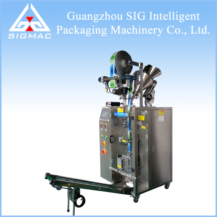 饮料冲泡粉剂包装机 广州西格厂家专业制造。 机器特点: *适合于食品、医药、化工产品中的松散、无粘性、120目以上的粉剂等。 *包装美观、平整,是众多企业的可以选择]。 *在短时期内就可以得到快速、精确、卫生的完美的包装产品。 *7寸彩色触摸操作屏、日本三菱PLC控制系统的设计能满足您特殊的要求。 ☆技术参数 *设备名称:饮料冲泡粉剂包装机; *机箱材料:不锈钢制造; *外 观 件:不锈钢及镀镍件制造; *显 示 屏:7寸彩色触摸显示屏; *控制系统:日本三菱PLC控制系统; *计量方式:粉剂采用螺杆计量; *包装材料:OPP/CPP,CPP/PE等可热封复合材料(≤320); *包装产品:按提供的实物; *包装容量:1-50ml 或 50-100ml; *包装速度:20-30包/分; *落料方式:自然落料加带振动敲击(PLC控制); *成 型 器:象鼻成型制袋器、宽度根据要求制作; *制袋尺寸:袋长:40-150 mm之间 袋宽:20-100 mm之间; *封口形式:中封平纹(即背封封口); *切断方式:花纹刀或平刀切断、圆角斜口式、带三角易撕口(冷切断形式); *跟踪方式:电眼识别跟踪或数控控制袋长; *气源气压:0.4-0.8Mpa; *电 压:220V 50/60Hz; *功 率:1.3KW; 公司名称:广州西格智能包装机械有限公司 公司地址:广州市荔湾区东沙紫荆道81号之一二楼东 ★ 包装机是以产品尺寸来决定机器型号的,所以顾客朋友们在咨询机器价格方面信息时,请尽量提供实物样品,或者产品尺寸。非标产品好是详细描述产品性质,这样业务员才能准确把报价和相关信息提供给您。