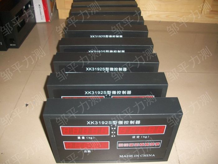 一、概述 1.1简介 该微控制器是专门为自动包装机和定量包装秤提供自动定量控制的仪表。本机是由单片微机控制,集称重、控制于一体的智能仪表。具有独特的抗干扰措施,能在恶劣的环境中使用。 本产品用于任何定量包装控制和定量称重控制的场合,广泛用于水泥厂、干粉砂浆、石膏粉、滑石粉包装机、搅拌站等场合。 1.2应用领域 自动包装控制(水泥自动包装机、干粉砂浆包装机、滑石粉包装机、石膏粉包装机、树脂粉包装机、钙粉包装机、硫酸锌包装机、淀粉包装机、 面粉包装机、粉体粉剂包装机、粮食包装机、腻子粉包装机、干粉包装机、颗粒包装机); 定量称重控制(比如:料斗进料的定量称重控制); 1.3主要功能 简易“傻瓜式”操作; 一键去皮功能; 工作状态 LED 指示; 2 路继电器开关量输出; 重量显示小数点位数可调; 可接任意量程的传感器 可以设置快加、慢加、提前量 1.4基本工作原理 该微控制器,接受传感器输出的模拟信号(压力拉力传感器均可,例如:为水泥包装机配套 200kg 拉力传感器),经内部采集处理后,计算并显示出秤体上物料的重量值。对秤体上物料的重量值与设定值的进行比较,如果重量值达到了设定值,控制器就输出控制信号给执行设备(如进行停止给料、掉袋等动作)。 三、配电接线图 仪表左侧 仪表右侧 传感器:连接传感器,多可并联 4 只传感器;暂不详解 外 控:可用于接大屏幕,预留。 保 险:为 0.5A 的保险 供 电:交流 220V±10% 传感器输入采用DB9插头。激励电压为5V,大输出电流100mA. 1脚:电源正;2脚:电源负;4脚:信号负;5脚:信号正。 控制信号输出采用的直径16的2芯航空连接器,。当重量达到设定值时,对应的输出连接器的输出脚1、2断路(断开),控制A或B指示灯灭。只有当重量小于设定值的80%时,计数次数加一,继电器闭合,指示灯亮。 四、操作说明 4.1前面板示意图 (1)、显示内容简介 袋重区: 五位数码显示,工作时显示瞬时袋重,校秤时可输入校秤砝码重量值。 出厂设定为 2 为小数,大显示 999.99。 设定区: 五位数码显示,显示A控制口的设定袋重值。大显示 999.99。(出厂设定值为 A 口、B口相等) 指示区: “控制”-当重量达到 A、B 设定的重量值时,其所对应的“控制”灯灭,同时对应控制口输出断开。 “稳定”-当所称量数值在 2 秒钟内没有漂动,“稳定”