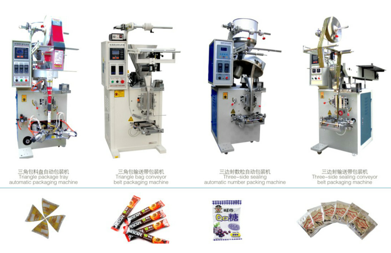 主要性能及结构特点: 优化设计、性能稳定、操作简单;扩展功置能强、可加连包装置,充气装置。满足不同产品的需要;产品的结构合理,方便清洁;制袋、计算、充填、封口、打印日期、产品输出一次性完成。 适用范围: 适用于食品、医药、化工产品中的松散、调味品、细小颗粒状及粉末物料的自动包装(如:汤料、干燥剂、味精、白糖、保健茶、芝麻糊、膨化小食品等)不易粘粉状的包装。 主要技术参数: 型号 三角包料盘自动包装机 三角包输送带包装机 三边封数粒自动包装机 三边封输送带包装机 包装速度(袋/分) 35-90 35-90 50-110 50-110 计算范围 5-100ml 5-100ml 5-100ml 5-100ml 制袋尺寸 (L):50-100mm (W):40-70mm (L):50-100mm (W) :40-70mm (L):50-100mm (W) :40-140mm (L):50-180mm (W) : 40-140mm 功率 1.2kw 1.2kw 1.2kw 1.2kw 重量 300kg 300kg 300kg 300kg 外形尺寸 900*720*1600(mm) 900*720*1660(mm) 650*1600*1600(mm) 650*1600*1600(mm)