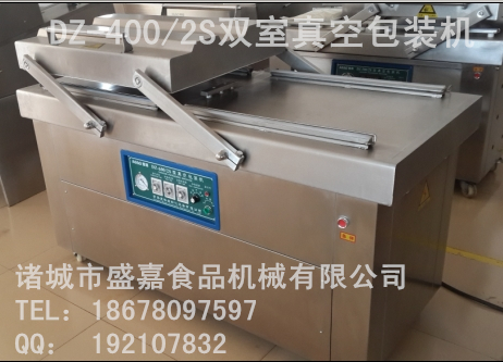诸城市盛嘉食品机械有限公司DZ400/2S双室真空包装机详细参数: DZ400/2S双室真空包装机|真空包装机|食品包装机械|小型食品包装机|小型真空包装机|食品包装机 包装速度:2-3(袋/分钟) 产地:山东潍坊诸城 电压:220V/380V 功率:0.8Kw 功能:抽真空封口 适用对象:酱类,谷物,水果 蔬菜 腌菜 腊肉类,食品 肉制品 海鲜 休闲食品等 自动化程度:手动 包装类型:袋 包装膜宽:400 mm 型号:DZ-400/2S 可否定制:可以 诸城市盛嘉食品机械有限公司DZ400/2S双室真空包装机主要技术参数: DZ400/2S双室真空包装机|真空包装机|食品包装机械|小型食品包装机|小型真空包装机|食品包装机 真空尺寸:530*506*110mm 封口长度:400mm*4条 封口宽度:8-10mm 封口线间距:400mm 包装能力:2-3次/分钟 电源:(220V)380V 0.8KW 重量:98(kg) 外型尺寸:1050*630*850mm 诸城市盛嘉食品机械有限公司DZ400/2S双室真空包装机产品详情: DZ400/2S双室真空包装机|真空包装机|食品包装机械|小型食品包装机|小型真空包装机|食品包装机 诸城市盛嘉食品机械有限公司DZ400/2S双室真空包装机由上工作室、下工作平台、架体、电气系统、真空系统 五大部分组成。 诸城市盛嘉食品机械有限公司DZ400/2S双室真空包装机机下工作台面采用不锈钢平面结构,既能方便清除工作过程中滴落在工作台上的液体或杂物,又能防止因包装酸、碱、盐等物品而引起的腐蚀生锈。 上工作室采用不锈钢材料,强度高,耐腐蚀:容积大、重量轻。加热元件全部安装在上工作室内,可避免受包装物品(特别是液体)的影响而造成的短路等故障,提高整机的可靠性。 诸城市盛嘉食品机械有限公司DZ400/2S双室真空包装机采用四连杆结构,上工作室可在两个工位上作业,操作方便,效率高,节约能源。 包装过程由电器系统自动控制,对不同的包装要求及不同的包装材料,设有抽气时间、加热时间、加热温度等调节旋钮,便与调整,以达到优秀包装效果。 诸城市盛嘉食品机械有限公司DZ400/2S双室真空包装机根据用户需求可配置印字功能,在封口处印制产品出厂日期、出厂编号等文字符号。 本机设计先进,功能齐全、性能可靠,结构紧凑、美观大方,质量稳定、效率高、使用寿命强,应用范围广,使用维修方便,是目前先进的真空包装设备之一。 诸城市盛嘉食品机械有限公司DZ400/2S双室真空包装机售后服务: 我公司售后服务网络遍布全国各地,并以不断创新的技术、先进的产品、稳定的质量、完善的服务、良好的信誉,使公司得到飞速发展。 DZ400/2S双室真空包装机|真空包装机|食品包装机械|小型食品包装机|小型真空包装机|食品包装机