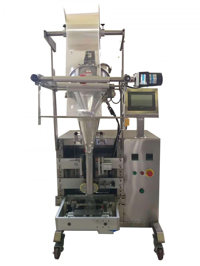 性能特征 设备展示图 "1、整机由进口可编程序控制器,伺服电机超大显示触摸屏构成驱动控制核心,性能卓越、操作简单; 2、本机与计量装置相配即可完成计量,送料、充填制袋、日期打印、成品输送的全部包装过程; 3、完善的自动报警器保护功能,将损耗降到低、帮助及时排除故障; 4、采用智能温控器,保证封口美观、平整; 5、本机可根据客户需要,三边封袋型、背封式袋型可自由转换。" 技术参数 样品展示图 ?项 ? 目: 指标及说明 型 ? 号: XY-800LB 计量范围: 40-500克(可定制) 计量精度: ±0.2克(根据物料不同的粗细程度而不同) 生产速度: 40-50包/分钟 包装材料: PE复合膜等适合热封性能的材料 计量方式: 量杯式计量 卷材宽度: 直径≤380mm 放卷外径: 直径≤320mm 放卷纸芯内径: 直径Φ76mm 成袋大小: 宽≤190mm*M建议小于270mm 气源压力: ≥0.6Mpa(由定做方保证供气) 操作人员: 1人 设备功率: 约 1.8Kw(220V) 设备外形: 约 L 1200×W 800×H 1850(mm) 设备重量: 约350Kg 适合行业: 适合物料: 颗粒、膨化食品、瓜子、白砂糖、花生等较大物料计量的包装