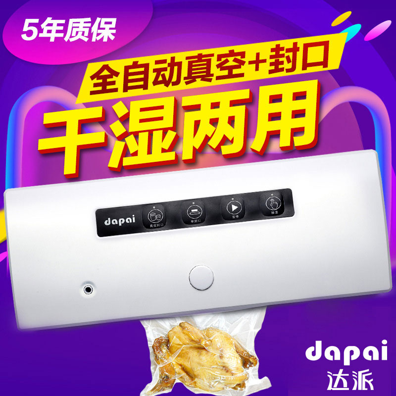达派真空包装机原厂供应 真诚的服务 无忧的售后 欢迎淘宝-天猫 京东等所有平台的掌柜前来合作! 批发更优惠 咨询合作QQ:2851528358,电话,官网www.tripodcn.com,www.cnair-bag.com,店铺www.dlspack.1688.com 品牌:达派 强劲的电机 达派DS2000真空包装机拥有强劲的电机,抽真空效率比同级产品提升90%,抽真空更快、真空度更高、声音细如丝,低于行业30%。 全新升级活塞式真空泵 1、寿命更长。防止液体进入电机,相比吸入式真空泵可以杜绝液体进入电机,寿命可达5-8年。 2、效率更高。每分钟转速高达2500转,真空抽力可达-80Kpa。 3、持久稳定。内置变压器供电,使用更安全,电压稳定无故障。 结构全新升级 独立重心设置 机器主要核心部分,在机器上部,重心在上,重力大,密封性以及真空速度明显比其他机器快,发热丝真正达到3MM宽“重压”+“宽压”结合让机器的封口效果“一封即合”。 分离式结构设计 抽液体的时候,不会担心弄湿机器主要部分,只需要90度直立,机器即可分离,把底部清洗即可。 十八般武艺样样精通 全能型抽真空,能够独立单封口、真空封口、点动封口、外抽功能、干湿两用、暂停功能、多包同时工作、过热保护等功能。 DS2000真空包装机使用范围广,适合生熟肉、海鲜、干货核桃、五谷杂粮、水果蔬菜、零食、红酒抽真空、保鲜罐抽真空、茶叶袋抽真空、大米米砖袋抽真空封口。 达派DS2000真空保鲜机,开启提升6倍尝鲜生活方式。