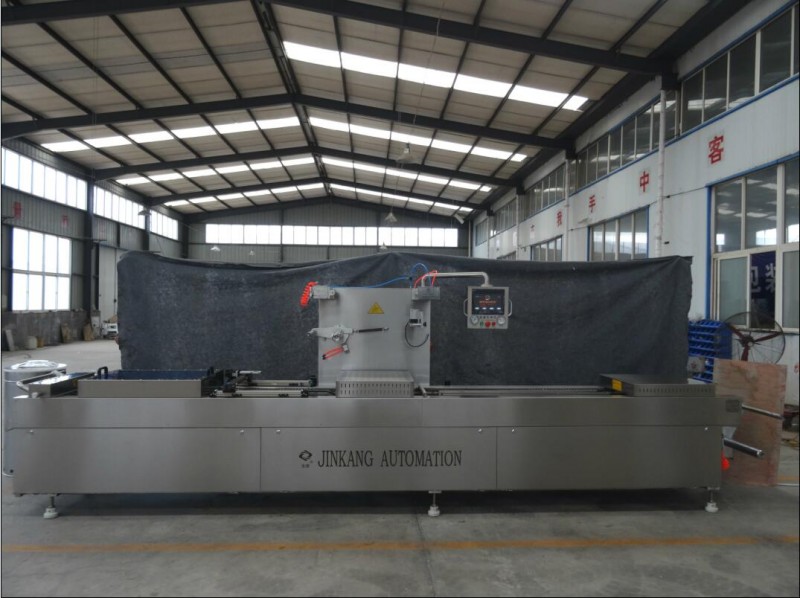 DLZ420拉伸膜包装机的设备名称Automatic continuous stretch vacuum packing machine, 各种休闲食品,肉制品,海产品,果蔬,酱菜,冷却肉,医药产品,五金元件,医疗器械等都真空包装都可以使用, 根据其用途,又名,卤蛋专业真空包装机,台式小烤肠、豆干、阿胶糕专用拉伸膜包装机等. I.全自动真空包装机主要功能 A. 光电后续:颜色覆盖膜或光学膜可用于包装,从而可降低成本和提高产品美观性; B. 采用模块化的模具,他们可以很容易地更换,并且可以在多台设备上使用.该模具有一个冷却系统; C. ,用于产品包装,氮或其它保护性气体,可根据用户的要求抽真空之后可以被填充到包装内; D. ,根据用于产品包装的用户的要求,机器可以用自动打码打印所需内容,或者是使用自动喷码.; E. 德国普旭泵使用在设备上,保证了设备的稳定的质量和良好的耐用性; F. 采用高品质的广开式链条,本机适用于拉伸成型和软膜,硬膜及不同厚度的半硬质薄膜的特殊包装; G. ,本机具有先进的冲压横向和纵向切割,可根据用户的要求切割,是您更换和操作简便的优选择; H. ,装有废料回收系统,以维持良好的环境,和人类健康的负责. 山东省诸城市金康自动化设备厂,专业生产拉伸膜包装机,意向客户可直接与我司联系详谈,金康自动化非常欢迎各位客户的参观考察.