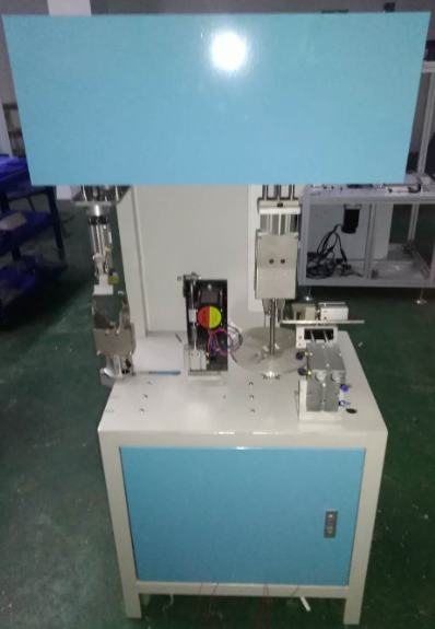 自动对接编织机送料口,提前送料要跟得上绕线速度可调节,送料轮同时记米,实现自动送料,自动缠绕,自动裁断,自动下料。 2.改横切裁刀为上下立切刀片,改单汽缸为双汽缸裁切,保证网料对于刀片中心位置,易全料裁断及不偏移中心,利于缠绕盘上料。如图: 3.改单根拔插绕线动力为加轴承座支撑绕线轴,气缸位于绕线轴与轨道支撑板中间,两点优点:一是让绕线轴有支撑点,二是气缸在力的中心位前进后退起到平衡作用。如图: 二.动作说明: 1.初始起点:开机首次人工上料至送料轮及复位动作。绕线盘两绕线杆垂直状态,绕线杆装拔插易脱装置。绕线杆推出.露于圆盘外.如图 2.缠绕盘上料:上料电机平行推进至缠绕盘上两杆之间穿过,料头超过绕线盘中心30m-50m可调,圆盘外切刀两侧为双轮夹料装置,然后退回松开气夹,编织网一直在上料夹口经过,尾部过线轮在绕杆近距离装置约20m m,汽缸闭合利用摩擦力控制缠绕的松紧度,汽缸压力可调,缠绕盘开始迅速启动缠绕,缠绕按照圈数设定圈数,圈数可以逐步调整到优秀圈数。 3.裁断部分:当记米到后几米时传输信号给绕线电机开始减速-----停止------裁切刀裁端------绕线盘继续旋转后几圈. 4.下料部分:当缠绕电机停止后,电机拔插轴在气缸动力退回至电机动力轴套,绕线杆退回及下料完成。如图: 主要参数如下: 产品名称 编织网全自动裁切缠绕机 备注 适用长宽度 长度3-30m,宽度20-300m m 适用材质 尼龙 绕线圈数 >1可调 功率 约2KW 工作气压 >6kpf/cm2 工作电压 220V AC12A 50/60HZ 重量 约250kg 外形尺寸 1500*1000*1500mm