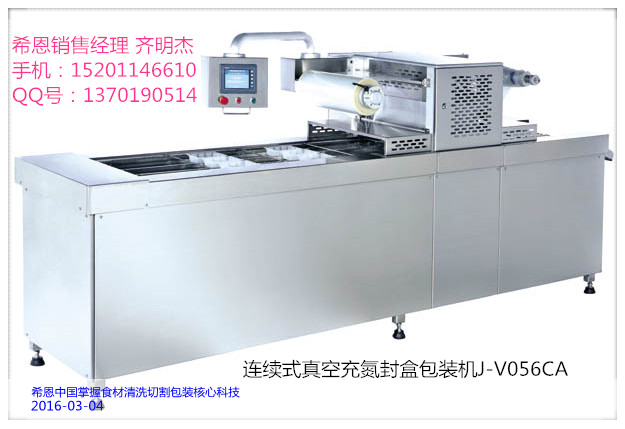? 概述: ? 真空充氮封盒包装机以真空充气将食品装入包装袋 ? 抽出包装袋内的空气达到预定真空度后,再充入氮气或其它混合气体,然后完成封口工序 ? 全自动连续真空包装机以塑料或塑料铝箔薄膜为包装材料 ? 对液体、固体、粉状糊状的食品、粮食、果品、酱菜、果脯 ? 化学药品、药材、电子元件、精密仪器、稀有金属等进行真空包装 ? 经真空包装的物品可以防止氧化、霉变、虫蛀、腐烂、受潮,延长保质保鲜期限 ? 特别适用于茶叶、食品、医药、商店、研究机构等行业 ? 具有外型美观、结构紧凑、效率高、操作简便等优点 ? 特性: ? 多国语言控制面板,原始设定显示字体为繁体中文,20组记忆功能,可记录设定参数值 ? 传动链条为不锈钢304结构高强度链条 ? 链条传送为伺服马达控制系统,精准且耐用 ? 封口胶膜可依包装内盒数量多寡做尺寸长度不同之变更,以减少余料浪费 ? 机器可同时应用透明式封口胶膜或已含印刷之胶膜 ? 余料卷收系统为纸管替换式,抽换简单及迅速 ? 封口温度可直接由触控式面板直接设定修改 ? 不锈钢SUS304制IP55防水防尘等级电气箱体并附锁管制 ? 封口裁切贴齐盒子边缘提供外型优秀化包装成品 ? 多样化包装,可单纯做封口用途或增购系统做真空、充气用途 ? 触控式面板提供机器运转监控画面,光电式安全盖系统,气动式模具提升机构 ? 触控式面板安装于移动式不锈钢转臂,操作员可于360度不同位置直接控制机器 ? 机器面板提供各种可能发生之异常情形并做警示通知,以利维修且简易判断 ? 传送链条移速可轻易由触控式面板做快慢之调整 ? 功能: ? 延长产品保存期限,持产品新鲜度、保存风味 ? 真空包装机应用领域: ? 卤制食品、肉品、农产品、水产品、腌渍物、素食品、豆馅、调理食品 ? 中药材、电子、医疗器材、药品...等 ? 选择配备:打印系统、自动入盒系统、真空收缩贴合功能、多种类包装盒 ? 技术参数: ? 型号:J-V056CA ? 机器尺寸: 3400×900×1550mm ? 入料平台长度:1400mm ? 出料平台长度:600mm ? 气压供应:6bar ? 工作效率:4-10次/min ? 真空泵:100m3/H ? 大盒子高度:100mm ? 一盒:270×370×100(depth)mm ? 二盒:270×170×100(depth)mm ? 三盒:270×100×100(depth)mm ? 电压:380V 3PH 50Hz ? 重量:950Kg