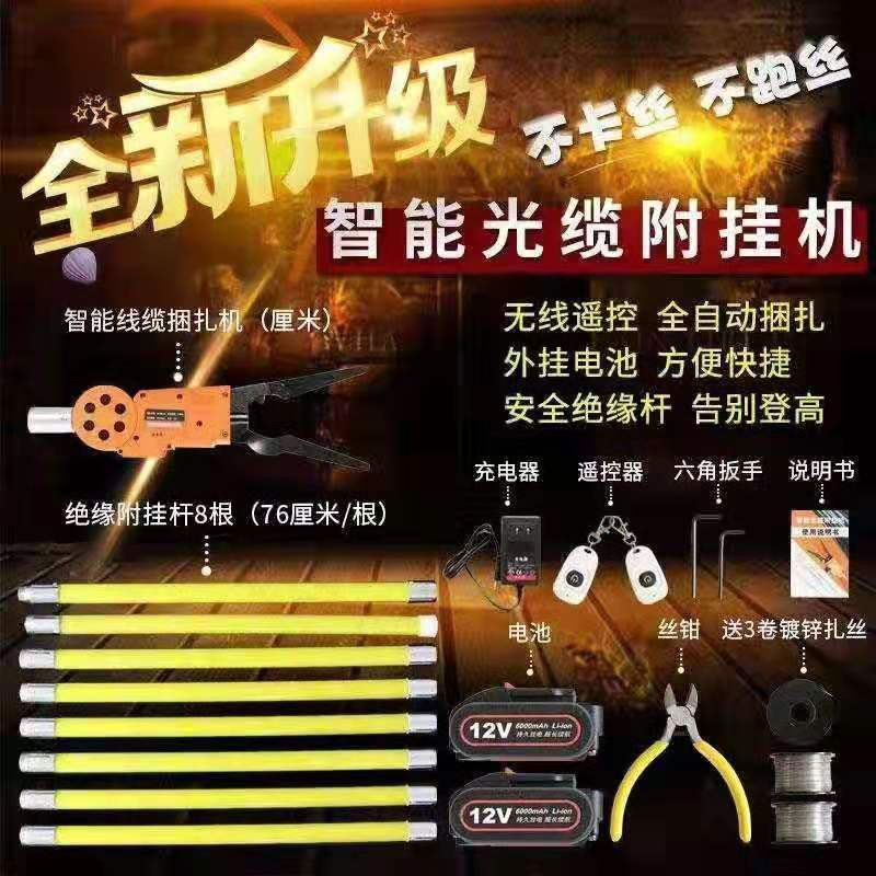 该机器是一种手持式免登高线缆快速附挂工具,内部放置控制器等电路元件, 能自动完成线缆附挂捆扎的所有步骤,可广泛应用于通信工程领域高空作业, 用于代替传统人工附挂捆扎线缆。该机器主要由机体, 线盘,电池,遥控开关,手持杆五大部分组成。标准配置:机身,一副附挂杆,两个遥控器,一盘镀锌铁丝,两块电池,一个充电器。