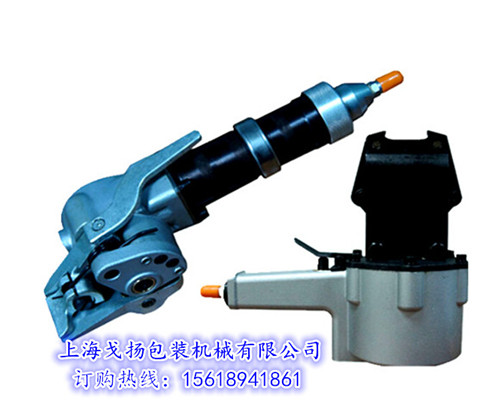 性能特点:两机联合完成捆扎作业:重量轻,移动性强,操作简便,捆扎牢固,适用于卷材、型材、管材、板材、铸锭、钢筋,不规则面及大型物件的捆扎包装一种标准化、规范化、国际化包装的必备工具 KZL-32G气动拉紧机(改进版) 品牌:上海戈扬 产地:上海 技术参数: 1.使用气压:0.4-0.6MPa 2.机体重量:5Kg 3.空载钢带速度: ≥5m/s 4.拉紧力:9.8KN 5.钢带规格:宽度(19/25/32)mm厚度:(0.8-1.2)mm 6.材质:铸钢 KZY-32G咬扣机(改进版) 1.使用气压:0.4-0.6MPa 2.机体重量: 3Kg 3.夹口承受拉力:16.85KN