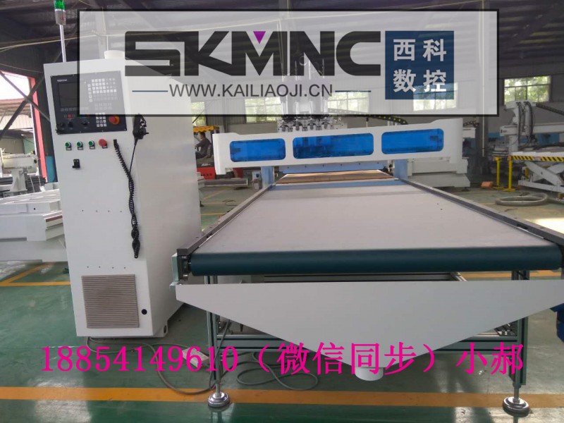 定制橱柜自动化电脑数控开料机 全自动封边机 数控侧孔机 销售人员:郝灵霞 手机:(微信同步) QQ:3544271544 济南西科数控设备有限公司位于山东省府-泉城济南,是一家集数控开料机研发、生产、销售、售后服务、维修于一体的现代化新型数控设备公司。济南西科专注于橱柜门生产设备企业,我们的产品有全自动上下料数控开料机、橱柜门加工中心、自动上下料自动贴标数控开料机、ptp加工中心,数控水平钻、全自动真空覆膜机、数控开料锯、全自动封边机,数控开料机、侧打孔机,全屋橱柜衣柜等 机器配置介绍: 1.操作系统:新代系统,系统稳定,高速加工不丢步,直接读取U盘数据,操作方便; 2.主轴:意大利专用切割头,切削力量大,加工速度快; 3.导轨:原装30方型导轨,使机器运行平稳,经久使用,滑块导轨安全可靠不变形 4.变频器:FULING,驱动力强,电流大,使主轴电机加工时更有力! 5.电压电器:控制柜内采用法国施耐德交流接触器,使控制系统更安全有效,保证机器正常运行,不断电; 6.机身采用日本欧姆龙OMRON原装光电开关,重复精度高,加工精确; 7.驱动系统伺服电机,并带有编码器检测功能,加工位置不对自动停止加工。防止造成板材浪费。 8.丝杠与齿条:Z轴采用台湾TBI 2510加粗预紧消隙滚珠丝杠,把运动时产生的间隙减小到小,机器定位准确;齿条为高精度斜齿条,传动速度快,精度高; 9.台面:采用高密度加厚电木板,批量加工,吸附简单,上料放料简单;5.5KW吸附泵,吸力强劲。 10.机身:整机结构全钢板一体无缝焊接,加厚钢横梁经过8小时时效回火处理,强度高,消除内应力,稳定性好,坚固耐用,长久使用不变形,保证了机器精度!整机净重2900kg。 设备功能介绍: 1、叉车将一摞板材放在上料处,在上料区有自动感应的上料感应开关每当机器自动抓一张板材上料处会自动升高至设备同样的高度方便下次抓料 2、自动打垂直孔 吸盘自动抓料后,定位气缸自动定位到板材优秀位置系统读取软件生成的G代码排钻自动打垂直孔。 3、自动开料(可开异型料)打孔完毕后进行开料(包含异型|)板材切割后退料装置下降到机器台面 4、黏贴条码到相应的板材 工作人员在下料区将条码贴到相应的板材上下料处光电开光自动感应板材取下后传送带自动将后方板材推送到下料处方便工作人员取料 5、下料区域有自动条码机自动打印条码,条码上包含板材规格、尺寸 孔位和客户信息等。 6、自动下料把切好的板材推至下料区同时吸盘自动抓取一块板材到上料平台上料的同时下料,工序不间断 双工位数控开料机 ? 本机是一款高效率、高性价比数控开料中心,双台面可互换,一张台面可加工,另一张台面可待料,交替加工减少工作周期中的待机时间; ? 机架采用龙门动柱式结构,机器各零部件以极高的精准度生产和组装起来,以确保机器高性能和稳定性,优良的质量和耐受性; ? 采用模块式设计,可以选择:单主轴 数控钻包、双主轴 数控钻包、三主轴、圆盘刀库自动换刀主轴、圆盘刀库自动换刀主轴 数控钻包五种模块单元; ? 采用侧挂式,单边3个法兰滑块设计结构,运行平稳,齿条导轨全防尘设计结构,导轨采用分段式结构,导轨更换无需专业人员,更方便; ? 进口数控系统,性能稳定,操作简单普通人经过简单培训即可完成操作,无需专业知识; ? 采用双层中空真空吸附台面,可吸附不同尺寸的板材,小开料板件可达25mm; ? 采用四方向、六动作板材自动定位系统,板材定位更快更精确,匹配板材上料到位自动检测系统,可有效防止板材在上料过程中可能出现的各种意外情况; ? 匹配中央智能除尘系统,可保证各个环节和部位的颗粒废料得到有效的清理和收集,可有效保证开料工作的连续性; ? 操作软件接口全面开放端口,强大的兼容性可与多种板式家具设计拆单软件无缝对接。 自动上下料加工中心 ? 将自动上料、优化开料、打孔、开槽、自动下料完美结合于一体,工序无间断,实现效率产出大化,强大的兼容性可与多种拆单软件无缝对接; ? 采用模块式设计,可以选择:单主轴 数控钻包、双主轴 数控钻包、三主轴、圆盘刀库自动换刀主轴、圆盘刀库自动换刀主轴 数控钻包五种模块单元; ? 采用200x250厚壁大方管T形结构,回火或震动矢效处理,进口五面体金属加工中心进行进行高精度铣削加工; ? 采用侧挂式,单边3个法兰滑块设计结构,运行平稳,齿条导轨全防尘设计结构,导轨采用分段式结构,导轨更换无需专业人员,更方便; ? 进口数控系统,性能稳定,操作简单普通人经过简单培训即可完成操作,无需专业知识; ? 采用双层中空真空吸附台面,可吸附不同尺寸的板材,小开料板件可达25mm; ? 采用四方向、六动作板材自动定位系统,板材定位更快更精确,匹配板材上料到位自动检测系统,可有效防止板材在上料过程中可能出现的各种意外情况; ? 整机设计结构,配备独有的上料及除尘机构,可解决上料带“尘”弊病,可真正实现无人干预连续工作; ? 匹配中央智能除尘系统,可保证各个环节和部位的颗粒废料得到有效的清理和收集,可有效保证开料工作的连续性; ? 配备中央自动润滑系统,设置每隔一段时间自动注油,确保机器高效运行; ? 全自动的上料、下料、除尘、定位系统,可有效降低人工定员、工作强度,提高生产效率,降低生产成本,提高产品的标准化程度; ? 西科数控开料机的优点 1. 自动排料 西科开料机软件可以实现智能化排料,实现