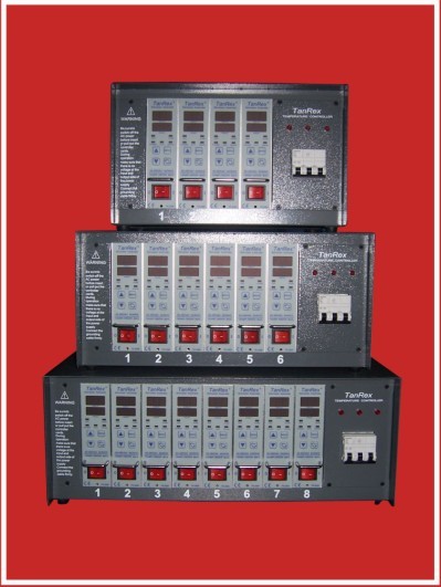 感谢您选购本公司TanRex系列高品质的温控器。本控制器具有如下特点: 1、 本控制器具有安全的软启动模式,经由向量比例方式控制输出电压(安全开机);控制器具有自动除湿去除水蒸气功能;另并能在模具与热流道系统漏电时,自动隔离;确保温控器安全使用! 2、 本控制器采用PID算法控制,具有PWM、SSR模式;其中PID有3种整定方式,适用于任何模具上工作。 3、 本控制器具有内建分析操作情况,错误时出现报警显示,以方便维修或及时提醒操作者排除故障,提高工作效率。如当非温控器本身故障,外部器件出现问题时,温控器也会有报警显示,且报警指示灯点亮。故障代码会显示在四位绿色数码管上。(热电偶接反,热电偶断路,加热线断路,加热圈损坏,可控硅击穿等) 4、 本控制器可同时显示温度设定点与温度实际值,以及温度输出功率、电压输出百分比和电流值。便于操作者随时掌握控制器工作状况。 5、 本控制器电压范围宽85-260VAC;可适应于全球任何国家、地区的电压;本控制器温度控制范围宽(0-537摄氏度);可适用于任何工程料、塑胶料;更是可直接控制模温(如40-200度区间),进而替代模温机;或是可直接控制500度以上铸造模具模温! 6、本控制器是国际通用型插卡式,在现有的热流道控制系统相容性上可容易达到维修与互换。 使用环境温度: 0°C----55°C 感温器类型: J型或K型热电偶 控温范围: 0°C----537°C(0-999o F) 控温精度: ±1°C 控制输出形式: 可控硅(Triac)输出 大输出: AC220V/15A 3600W 输入电源: AC85----400V 50/60Hz 注: 1、插卡式温控箱1-30点均有成品现货;32点以上需定做。 2、温控箱所用配件:德国SIEMENS断路器,台湾进口风扇,意大利GW连接器。 3、温控箱接线方式:1、2加热圈3、4(3+,4-)热电偶;可按客户要求接线。 4、温控卡、时序卡、温控箱、时序控制器均可做贴牌,或按客户要求定单生产。