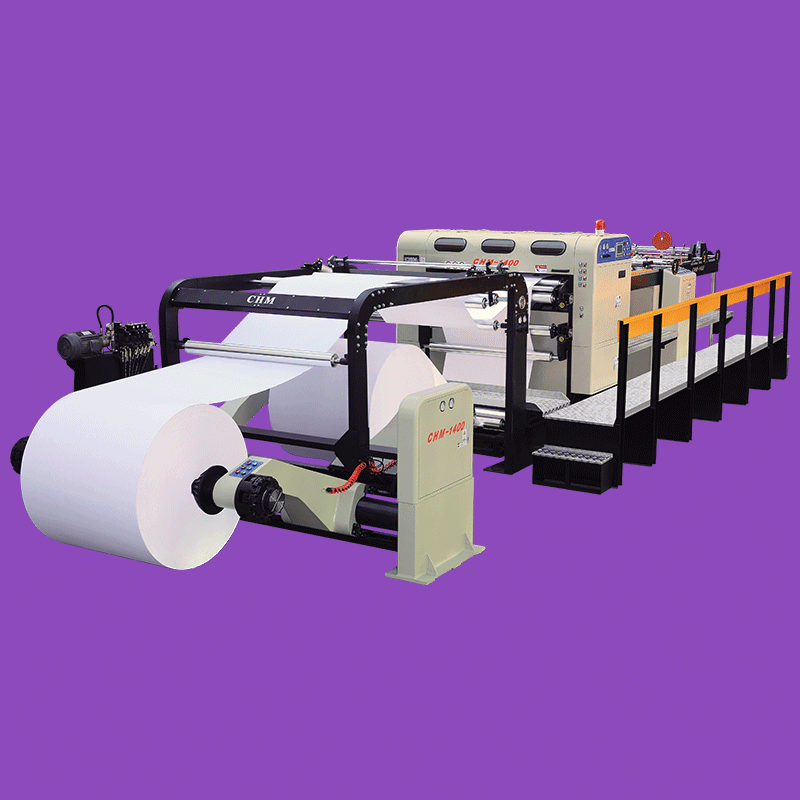 CHM-1400/1700/1900 高速卷筒纸分切机 伺服传动电脑高精密卷筒纸分切机,广泛应用于卡纸、铜版纸、牛皮纸、文化纸、双胶纸、高光相纸、金银卡纸、铝箔纸、激光镭射纸、烟酒包装纸等。是目前造纸业及印刷业中普遍采用的纸制品加工机械。 CHM pcision high speed sheet cutter widely apply to cut paper, board, art paper, kraft paper etc in the paper converting, packing and printing industry. 切纸型式(Cutting Type) 上刀回切,下刀固定(Top blade rotary , bottom blade fixed) 纸张适用范围(Refence weight of cutting-paper) 60-550GSM 切断精度(Cutting accuracy) ±0.5mm 高切断速度(Max.speed of range) 300sheets/min 高切断米速(Max.cutting speed ) 300m/min 切断长度范围(Cutting length range) 450-1650mm 大卷筒纸直径(Max scroll diameter) Max 1800mm (71‘’) 纸板堆纸高度(Paper-piling height) 1300mm 大切纸宽度(Max.paper-cutting width) 1400mm/1700mm/1900mm 总重量(Weight) 12000kg/13000kg/14000kg