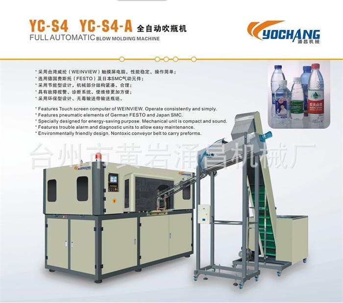 台州涌昌机械厂生产矿泉水吹瓶机,全自动吹塑机。 矿泉水吹瓶机,全自动吹塑机采用欧姆龙触摸屏,性能稳定、操作简单。 选用美国派克和日本SMC气动元件;节能型设计,机械部分结构紧凑、合理;具有故障警报、诊断系统、使维修更加方便。 环保型设计、无毒输送带输送瓶胚。先进的操控平台以及稳定的性能。 装配远红外灯管加热管瓶坯。 装配气缸代替油泵来驱动、使维护更简便、噪音更小。 低投入高产能、操作简便、维护简单、自动化程度高、高压锁模。 主要参数: Main parameters: 名称 heading 单位 Unit 数据 Data 理论产量 Theoretical output Pcs/hr 3500-4000 瓶子容积 The bottle Capacity L 2 瓶坯口径 Preform caliber MM 40 大瓶子直径 Maximum The bottle diameter MM 150 瓶子大高度 Maximum height of The bottle MM 350 模具腔数 Mould cavity number PC 4 主机尺寸 Machine size M 3.6*2.1*2.3 主机重量 Host weight T 3.0 上料机尺寸 On the feeder sizes M 2.1*1.3*2.5 上料机重量 On the feeder weight T 0.25 大加热功率 The maximum heating power KW 42 机器安装功率 Machinery installed power KW 45 公司介绍: 台州涌昌机械厂是一家专业生产吹瓶机及模具的企业,本公司技术力量雄厚,生产设备精良,检测仪器先进,管理体系健全。cy多功能吹瓶机 是本公司研发出的一种操作简单,成功率高,适用性广,可靠稳定的吹瓶机。它采用德国、日本、台湾等国内外的名优产品,控制系统以普通 电路P程序控制二类为主,设计时以高效益,高精度,维修方便、安全可靠,集美观,耐用于一体,此产品定能保证您的生产发展,企业蒸蒸 日上。 我们以优良的品质、是在的价格及周到的售后服务赢得广大新老客户的信赖。创一流产品,让顾客满意是我们大的心愿! 涌昌机械不单品质优良,而且价位不高。公司以科学的生产流程和先进的管理提高工作效率,降低工人的劳动强度,节约能源,从而大大降低 了生产成本,为客户提供多款物美价廉的生产设备。到公司采购设备的客户络绎不绝,生产车间则以高效的运转来满足销售的需要。 涌昌机械厂有一支专业的售后服务队伍。客户的机器出现问题,能及时沟通解决,为客户的长远发展、持续赢利保驾护航。