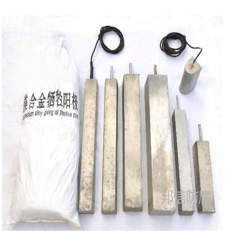 预包装埋地镁阳极 镁合金牺牲阳极11公斤 管道阴极保护材料 预包装镁合金牺牲阳极(预包装镁阳极)主要由一只镁阳极和专用热收缩套管、电缆线组成,阳极体采用在阳极体周围装上所要求成份的填包料。 镁合金牺牲阳极是为了保证阴极保护工程施工质量以及简化现场施工程序而开发的,施工方便快速、将原来在施工现场进行的操作在工厂里完成,有效保证了阳极地床的施工安装质量。 镁合金牺牲阳极 MG-11 规格 700×(90+100) ×90 裸镁阳极重kg 11±0.3 镁合金牺牲阳极填包料配方 填包料配方,重量% 适用条件 石膏粉(CaSo4.2H2o) 工业硫酸钠 工业硫酸镁 膨润土 50 0 0 50 ≤20Ω.m 25 0 25 50 ≤20Ω.m 75 5 0 20 ≥20Ω.m 15 15 20 50 ≥20Ω.m 15 0 35 50 ≥20Ω.m