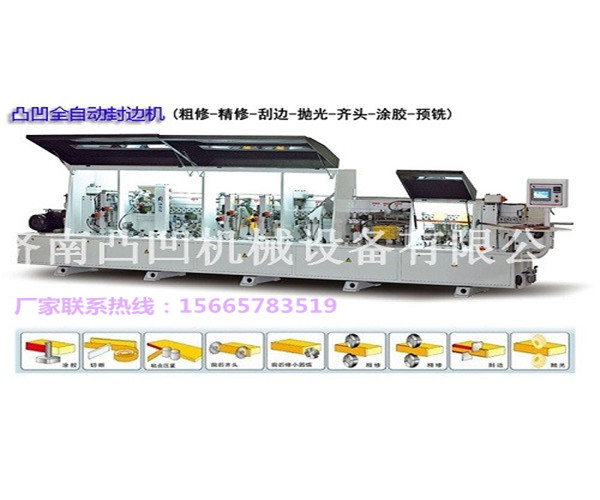 济南凸凹机械设备有限公司/)主要致力于研发和制造多款CNC精雕机,数控雕刻机,数控钻攻机,模具雕铣机,石材雕刻机,木工雕刻机等。以过硬的产品质量、优良的运作方式和完善的售后服务,赢得了各层次用户的信任,在行业内获得较高声誉。 厂家联系热线: QQ 2801301420 产品介绍 凸凹全自动直线封边机主要适用于胶合板、纤维板、微粒板等断面的直线封边。全自动直线封边机结构紧凑,布局合理,外表美观;采用了隔音、集尘口、防过载等装置;全自动直线封边机具有前后自动切断、45度上下浮动升降全自动双精修边、上下刮刀、表面抛光等工作单元,是一种新型、多功能,高速全自动封边机深受木工家具厂家的青睐。 设备配置 1、电子仪器自动减压自动补压。保护了设备在齐头方面的主动保护性。 2、电子电器方面采用进口电子元件,保证了设备的稳定性。 3、设备整机轴承均采用进口轴承,保证了设备的平稳性。钢板采用特殊材质,永不变型。 4、采用大功率高速变频电机,高转速22000转。 5、全自动封边机整机加工部件,全部用加工中心制作,保证了设备的稳定性和精确度。 6、 严格的采购过程以及精密的制作工艺。终身跟踪服务。 产品参数 数据名称 数据参数 板材长度 Min.120mm 板材宽度 Min.80mm 板材厚度 10~60mm 封带宽度 12~65mm 封带厚度 0.4~3.0mm 进给速度 12~20m/min 输入电压 380V 输入频率 50HZ 输出频率 200HZ 总功率 13KW 空气气压 0.7pa 机器尺寸(长*宽*高)mm 5660*1000*1600mm 凸凹全自动直线封边机摆脱了对技术工人的依赖,是棺材、家具、柜体厨具等封边的好帮手,封边切合度完美,不会出现错位等现象,深受广大客户喜爱,所以你还在等什么呢,快来联系我们吧。