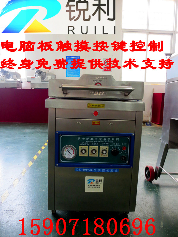 武汉锐利食品机械有限公司提供单室真空包装机湖北真空包装机价格。RL-400单室真空包装机 性能特点: RL-400单室真空包装机工作尺寸大,是一款性价比很高的机器,适合中 小企业对产品的包装需求。经包装后的产品可防止氧化、霉变、受潮、振动,可保质 保鲜延长产品储存期限。RL-400单室真空封口机大封口长度为400mm,适合对细长 的物体进行真空包装,例如机械零件、鲅鱼等。整机外壳和内部均为304不锈钢,电 脑板触摸按键控制。适用豆制品、肉制品、熟肉,酱腌菜及其它干品、低水份产品的 保鲜包装。 技术参数:品名/规格 RL-400单室真空包装机 真空尺寸:(L)910mm×(W)770mm×(H)200mm 封口长度 500mm×2条 封口宽度 8-10mm 包装能力 60-160次/小时 外形尺寸: (L)780mm×(W)660mm×(H)970mm 电 源 380/220V.50Hz 机器重量 90kg 适用范围: 适用于塑料复合薄腊或塑料铝箔袋、防静电袋等软包装材料。对固体、液体、粉状、 糊状的电子产品、线路板,SMT贴片料盘、玩具、茶叶、食品、果品、化工产品、电 子元件、精密仪器仪表等进行真空包装。 售后服务:终生免费提供技术支持和零配件供应,零配件按产品成本价提供给客户, 客户使用放心。