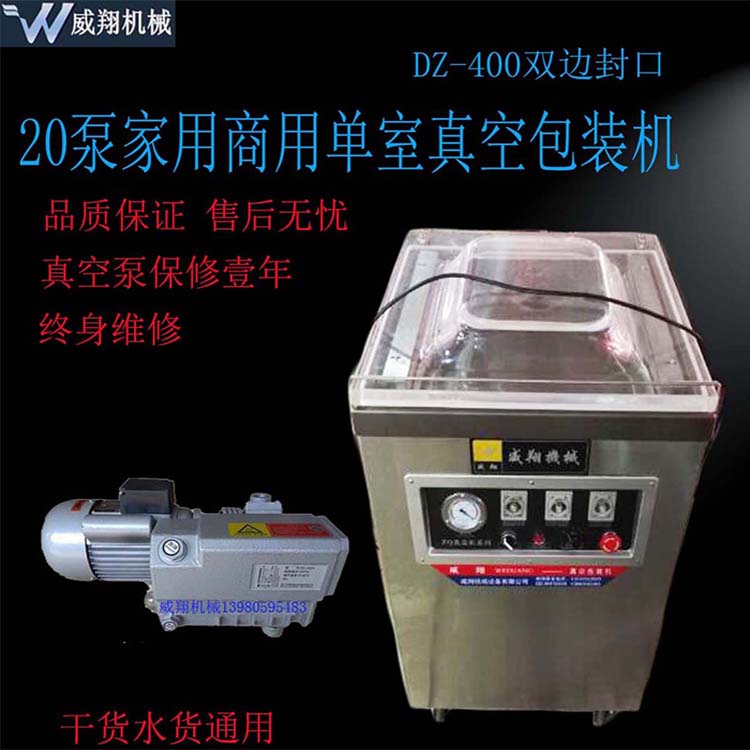 绵阳肉制品真空包装机400单室食品包装机厂家 真空包装的主要作用是除氧,以有利于防止食品变质,其原理也比较简单,因食品霉腐变质主要由微生物的活动造成,而大多数微生物的生存是需要氧气的,而真空包装就是运用这个原理,把包装袋内和食品细胞内的氧气抽掉,使微生物失去“生存的环境”。真空包装不能抑制厌氧菌的繁殖和酶反应引起的食品变质和变色,因此还需与其他辅助方法结合,如冷藏、速冻、脱水、高温杀菌、辐照灭菌、微波杀菌、盐腌制等。 400单室真空包装机技术参数 机器型号:DZ-400/2D 材料应用: 不锈钢 封口长度: 400mm 双排间距: 380mm 搁物高度: 120mm 包装能力: 2-4次/分钟 电源形式: 220V 整机功率: 0.9KW 极限真空: 200PA 真 空 泵: 旋片式XD-020 电器应用: SCF-P延时器控制 整机重量: 50kg 家用店面用小型单室真空包装机厂家批发 特 点:该机型为经济用户形式,单室开启,移动方便、包装效果佳、能耗低, 用途及特点:单室真空包装机是一种用于真空包装的小型包装机械。该机具有功能优越,维修方便,操作简易、应用广泛等优点。适用于塑料复合薄腊或塑料铝箔袋、防静电袋等软包装材料。对固体、液体、粉状、糊状的电子产品、线路板,SMT贴片料盘、玩具、茶叶、食品、果品、化工产品、电子元件、精密仪器仪表等进行真空包装。经包装后的产品可防止氧化、霉变、受潮、振动,可保质保鲜延长产品储存期限。