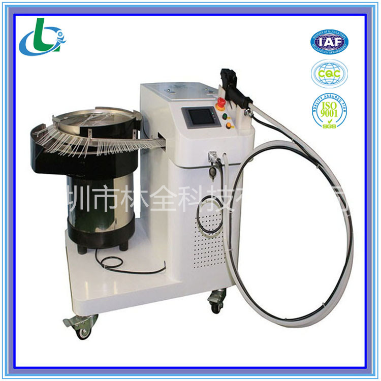 手持式全自动扎带机 1、配备螺旋式送料振动盘,散装尼龙扎带实现自动上料,免去人工放料之繁琐工序 2、整机带脚轮、易于搬运和移动;手持枪头轻,整个枪柄小巧易握,即使长时间使 用也不会觉得疲劳 3、只需轻轻扣动扳机,自动完成送料、穿料、锁紧、切断、抛废料等全部动作 4、切断后的扎带废料直接回收至枪头废料盒,定时清理即可 5、配备专用扎带输送管道,适用多种扎带类型,特殊扎带除外 6、一台机器可代替7或8个工人,一年可节省用工成本约25万元 7、根据捆扎物直径不同,可调整枪头上的旋钮来控制捆扎力度 8、主机配备中文液晶触摸屏,分自动和手动两档,一键式简单操作 9、适用家电汽车等线缆捆扎,同时适用其他领域分装固定整理打包等的捆扎 手持式扎带机型号: MR01 手持式扎带机电源: 主机 AC 220V 50/60Hz 枪头 DC 24V(自动转换) 手持式扎带机功率: 350W 扎带规格: 2.5×100mm(因扎带规格不同技术参数略有变化) 空气压缩: 0.5MPA 动作周期: 0.8s~1.2s/根 (一个周期包含送料、卷带、收紧、切断、抛废料等动作) 小束线直径: Φ2.0mm 大束线直径: Φ22mm 大束管直径: Φ18mm 触摸屏: 中文液晶显示,简单易设定 手持式扎带机尺寸; 主机 L700×W520×H600mm 枪头L260×W80×H50mm 重量: 主机 70Kg 枪头0.7Kg