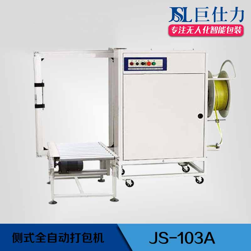 侧式全自动打包机 侧式全自动打包机JS-103A 机械尺寸/Machine size: 800×600(m/m) 捆包速度/Strapping speed: ≤2.5秒/道 电 压/Power: 380V/50HZ 750W/5A 带 宽/Strap Width: 9~15mm 侧式全自动打包机采用机芯侧置的结构形式,特别适用于有粉尘,液体及海产品等包装物的纸箱的捆扎,不用担心粉尘,水滴及其它腐蚀性液体对机芯的磨损和腐蚀。输送机上设有球型触动开关,方便自动操作。机器整体采用前后双门式结构,可方便的打开进行穿带,检修或保养工作,操作面板可根据需要进行前置或后置,科学的设计使用户可根据场地及操作需要在生产线上灵活的布置机器。侧式全自动打包机适用范围:适用于粉尘、液体、海产品包装物的捆扎。