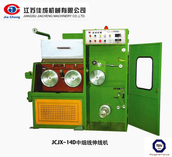 一、产品简要介绍: JCJX-14D型中细线拉丝机用于将Ф0.8mm-Ф1.5mm铜线拉制成Ф0.25mm-Ф0.5mm铜线。动力为双变频控制,水平两轴式的主机结构,一体铸造。本机具有保养方便、操作简单、低噪音、节能、高效率等优点。 二、设备主要组成: 本设备由放线架、拉丝主机、张力架、收线部分、电气控制系统等组成。 三、设备主要技术参数: 产品型号 JCJX-14D 入线线径范围(mm) Φ0.8~Φ1.5 出线线径(mm) Φ0.25~Φ0.5 高线速度(m/min) 1200 拉丝塔轮 喷瓷处理 机械减面率(%) 15 主电机功率(kw) 15 收线电机功率(kw) 5.5 定速轮直径(mm) Φ268 传动方式 平皮带 收线盘尺寸(mm) Φ300/Φ400 排线方式 同步电机+平皮带 张力调整方式 配重式 拉丝润滑方式 喷淋式 制动方式 电磁刹车 四、主营产品或服务: 框绞机、铜大拉机、铝大拉机、铜线拉丝机、超细线拉丝机、铜包铝拉丝机、铜包钢拉丝机、不锈钢线、黄铜线拉丝机、铜线绞机、退火机、在线退火机、铜镀铜机、滑轮式拉丝机、直进式拉丝机、铝镀铜机、管绞机、成缆机、绞线机、拉丝模具、配套线盘、多头拉丝机(带退火)、塑料中空机。