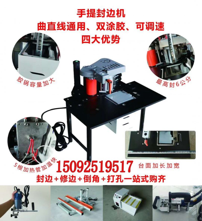 木工家装封边机 ,曲型直型异型台式封边机 适用封边条种类:PVC、木皮、塑料等常用材质封边条 双面涂胶技术 双面涂胶就是在封边条与板材上面都均匀的涂上热熔胶,使封边条与板材之间容纳的胶水更多,黏贴更加牢固,冷却之后撕扯不下来,数年之后也不会掉边开裂。 伸缩式大台面 伸缩式支撑悬臂,可按照板材大小调节台面宽度。 支承悬臂设有滑轮,板材推动更加省心省力! 自动定时即时断带三大功能 1、封直线板材,可通过行程开关使用自动送断带功能,便捷操作。 2、批量封同样尺寸的板材,可使用微电脑设定定时断带功能,提高效率。 3、封异形板材,可使用脚踩开关即时控制送/断带,精准控制。 性能特点:手动封边机采用自动控制,封边作业范围大,可保证热熔胶不糊不漏,适用于各种板材的直曲线封边,体积小,重量轻。功能超越普通进口直线封边机,是早进入中国市场的封边机之一。适合各家具、橱柜、 曲直线双面涂胶木工封边机,在吸取了国内外手动封边机优点的基础上,再结合多年制造木工机械经验,研制出来的手动封边机,不仅操作方便,而且结构合理。适合各种形状家具的封边作业。