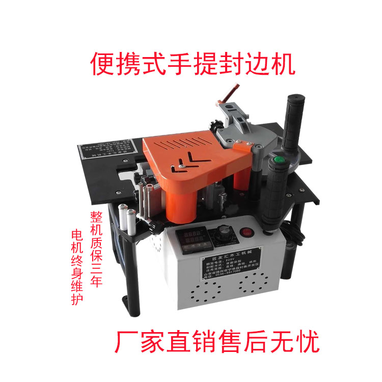 手提封边机详细说明 首先它可以直接适用于板式直线与弧形不规则边框封边作业,手提木工封边机安装上固定支架配件时,其使用方式则与传统曲直线手动封边机相仿,手提封边机同时适用于各种不同材质的封边带:如三聚氰胺(浸渍)纸、木皮、塑料(PVC或ABS)等。 手提木工封边机有以下优点:精简、轻便、质优、价美。 手提木工封边机可随意的转换工作场所,到达装修工地进行现场施工,适合装修行业使用。 经过我厂数年的研发,新产品已有趋于完善及全面的附加功能: 1.封边带的适用宽度范围增加至10mm-60 mm 2.主机供胶系统:供胶轴上下两支点固定,结构稳定,坚固耐用。 3. 特殊胶盆保温设计; 容量加大且预热时间短。 4. 温控器:根据封边带及热溶胶所需的溶胶温度,自动控制温度。 5. 调速器:根据不同涂胶和压带需要调整机器速度。 6. 所有电器配件均达到UL及CSA标准,整机已符合CE认证。 型号09 机器尺寸:400*400*360mm 机器使用前预热时间:约5--7分钟 机器封边速度:约2-6米/分 机器使用材料及工件 1、适合封边带: 可弯曲的三聚氰胺浸渍纸,木皮,塑料等家具封边材料. 涂胶面必需平整. 塑料封边带,必需涂上热溶胶时受热不边形. 塑料封边带,涂胶面必需预先涂上背涂胶(能使封边带背面与热溶胶的激活剂). 封边带厚度: 0.3—3mm 封边带的宽度:0.8--60 mm 板材小宽度0.8 mm 板材小长度300mm 2. 适合的热溶胶: 熔点120—170以下的中低温热溶胶. 3. 适合工件边框: 能与热溶胶粘合的木板,刨花板,中纤板,微粒板等各种板材边框. 4. 边框的形状: 直边,曲线,外弧,内弧及圆周( 弧半径20mm以上). 边框长度不限。