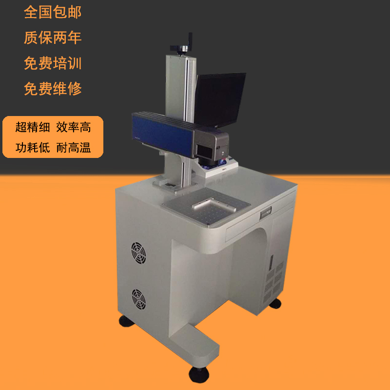 产品特点: 速度快、配合高速振镜;体积小,重量只有10KG;无耗材,低耗电,功耗小于500W完全风冷,不需要水冷机,能耗降低;不受恶劣环境和气温变化影响,在停电状态下可使用蓄电池、汽车点烟器进行工作;产品折旧成本可以大大降低,可充分满足客户大批量、稳定的生产。 激光原理: 激光打标是利用 密度激光束,对工件表面进行局部照射,使表层材料迅速汽化或发生颜色变化,从而露出深层物质,或者导致表层物质的化学物理变化而刻出痕迹,或者通过光能烧掉部分物质,显出所需刻蚀的图形、文字。 优势: 采用第三代固体光纤激光器,电光转换效率高达60%,优异的光束质量M2<1.42.好的光束质量,创造出 精细打标效果3.采用原装SCANLAB扫描头。标记速度飞快,是普通CO2及KT半导体打标机的4倍以上,从而为您节约昂贵的人工工资4.全风冷、无耗材、五年免维护、使用成本低廉。功耗小,无水冷系统,柔性光光纤输出,使用更加便捷,省电节能,整机功率仅500W。相比灯泵浦和半导体激光打标机每年可节约电费2-3万元。5.一体模块化设计,方便维修,体积小巧。节省您宝贵的厂房空间。6.标记环保, 不褪色,符合RoHS标准 用途 :卫生洁具、食品包装、烟草打标、啤酒打标、饮品打标、药品包装、医疗器械、眼镜钟表、汽车配件、塑料纸料、电子五金