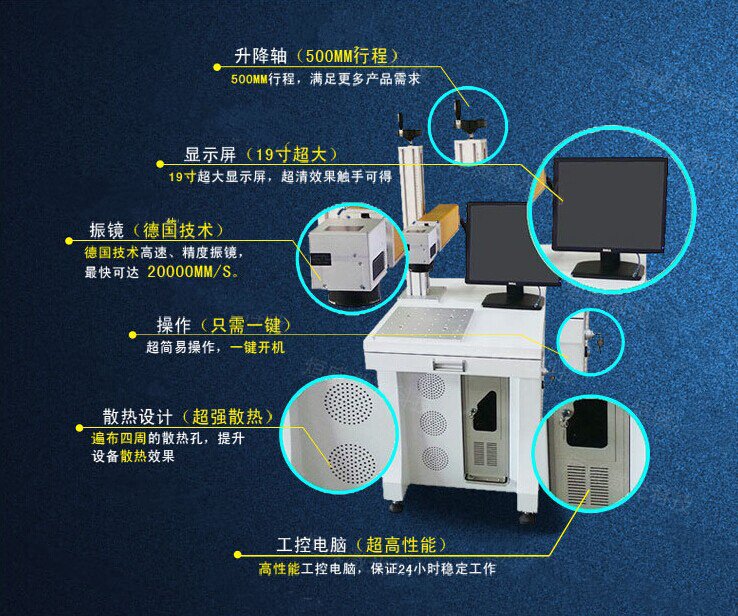 产品介绍: 光纤激光器采用一体化整体结构,无光学污染、功率耦合损失小,在激光打标应用方面具有许多独特的优势。 应用范围: 该系统适用金属(含稀有金属)、电镀材料、镀膜材料、喷涂材料、塑料(含工程塑料)、彩色纸皮、皮革、陶瓷等材料的打标。 打标样品: 优点: 优秀的光束质量: 光纤激光打标机光束质量比传统的固体激光打标机好很多,为基模(TEMOO)输出,聚焦光斑 直径不到20um。发散角是半导体泵浦激光器的1/4, 特别适用于精密、精细打标。 使用成本低廉: 电光转换效率高达到30%,整机耗电不到500W,是灯泵浦固体激光打标机的1/10,大大节省能耗支出。 免维护操作: 激光器无需进行任何维护,也不用调整或清洁镜片。 激光器使用寿命长: 光纤激光打标机使用激光二极管作为泵浦源,其平均工作时间可达10万小时。 体积小巧、适用于恶劣环境: 激光器通过光缆实现激光距离传输、结构紧凑。 散热效果好无需庞大的水冷系统,只需简单的风冷即可。 在一定冲击、震动、较高温度或有灰尘等恶劣的环境下也能正常工作。 加工速度快: 加工速度是传统激光打标机的2-3倍。 技术参数 SW-FLM10 SW-FLM20 大激光功率 10W 20W 激光波长 1064nm 激光重复频率 ≤100KHz 标准雕刻范围 100mm×100mm 选配雕刻范围 50mm×50mm ;150mm×150mm ; 200mm×200mm 光束质量 <2M2 雕刻深度 ≤1.2mm 雕刻线速 ≤7000mm/s 小线宽 0.01mm 小字符 0.15mm 重复精度 ±0.001mm 整机耗电功率 ≤800W 电力需求 AC220V±10%/50Hz 控制接口 USB t或PCI 冷却系统 风冷 产品维护: 1.自安装调试正式投入使用的日期起,供方负责提供壹年的免费保修,如有器件在正常使用下发生失效或损坏,供方负责免费上门维修或更换。 2.需方电力供应异常,机器工作环境恶化,操作使用不当,人为损坏和自然灾害等而引起的机器故障或器件损坏不属免费保修项目。 3.供方保证在接到需方维修电话,在24小时内必须响应到场解决问题。 4.供方提供该设备软件升级的终身免费服务。 5.保修期内,如设备需返回公司维修,公司提供临时替用品供卖家使用。