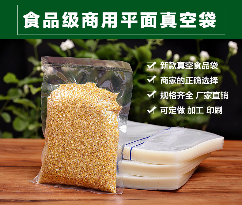 该产品广泛用于熟食、烧鸭、烧鹅、酱牛肉、盐焗鸡等;酱腌菜、榨菜、萝卜干、海带丝、酸菜、咸菜、泡菜、干货、冬菇、香菇、木耳、腐竹、紫菜、红枣、枸杞、桂圆、杂粮、花生、绿豆、红豆、黄豆、大米、小米、玉米、茶叶、咖啡、可可、香精、香料、食品添加剂及化妆品的保香保色等包装。 尼龙真空袋 性能优良 氧气透过率低,抽真空效果佳 防潮性能好,抗拉强度与耐刺穿强度高 易热封、密封性能好,不易老化 外表美观 外观美观,透明度很好 QQ:823279950 手机:18046908686