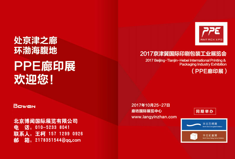 2017京津冀(廊坊)国际印刷包装工业展览会2017?Beijing,?Tianjin?&?Hebei?(Langfang)?Printing?and?Packaging?Industrial ?Exhibition 时间:2017年10月25-27日 地点:廊坊国际会展中心 同期:京津冀绿色印刷推广周暨廊坊印刷人才招聘会 指导单位: 廊坊市人民政府 主办单位: 廊坊市文化广电新闻出版局 廊坊市印刷协会 协办单位: 河北·廊坊国家包装印刷产业园 廊坊经济技术开发区 支持单位: 北京印刷协会 天津市印刷技术协会 河北省印刷协会 承办单位: 北京博闻国际展览有限公司 展会背景: 随着我国国民经济的快速增长,作为国民经济的配套服务型行业,印刷包装行业得到了迅速发展,“十一五”期间,我国印刷包装业总产值年均增长19.3%,远远高于同期国民经济的增长率,目前,整体规模已经接近全球第二位,发展态势良好。预计到“十二五”期末,行业总产值将超过11,000亿元人民币,并成为全球第二印刷大国和世界包装中心,同时逐步实现向印刷包装强国的转变。 在国家政策的大力支持和积极引导下,具有较强竞争优势的包装印刷企业已开始逐步通过技术创新,转变发展方式,以推动包装印刷行业的转型升级。在行业整合升级的过程中,技术水平落后和不符合绿色环保印刷发展方向的包装印刷企业将会逐步被市场淘汰,这有助于提升我国包装印刷业的整体国际竞争力,促进我国包装印刷行业的健康有序发展。为了帮助企业技术更新和陈旧产品换代,特此举办2017京津冀(廊坊)国际印刷包装工业展览会(廊印展)暨京津冀绿色印刷推广周、廊坊印刷人才招聘会,将于2017年10月25-27日在廊坊国际会展中心举行。以“绿印未来”为主题,全面邀约国内外新技术设备及材料企业前来参展,本届展会紧扣印刷市场趋势、直击购买市场,为供需双方带来新的发展契机。 为什么要参展? 选择廊坊就是占领华北市场。受区域经济发展影响,我国包装印刷产业主要集中分布在长三角及华东地区珠三角、环渤海区域。廊坊是京津冀地区印刷包装企业聚集中心,辐射周围30公里范围内,孕育着3000家以上的大中型印刷包装厂家,形成了强大的市场购买力。 怎样来确保观众? 参观团10人以上免费提供大巴专车接送,外阜卖家展前预登记可免费提供食宿。 为了展会效果达到预期,主办方在招商初期成立20人的客服部,收集、走访周边印刷包装企业信息,用一年的时间建立完善的数据中心,并对印刷包装厂家进行一对一的电话邀约。在开展前3个月,将在京津冀地区的主要交通要道及印刷集中区,大量投放户外广告增强观众影响。开展前1个月召开新闻发布会,通过战略合作的200多家媒体(电视台、报纸、行业杂志、门户网站)对招商情况进行发布,开展前10天,通过一年来建立的数据库,找到确切的负责人快递直邮门票,确保观众如期参观,开展前3天,通过数据中心发布展会参观提醒信息,以免误时参观。开展期间还将邀约50余家媒体对展会现场实时报道,增加展会的互动性和后期效应。 (我们的宣传不仅仅是这些,详细推广方案请来电索取) 如果您是以下产品请来参展: 1、印刷机械设备及耗材展区: 印刷机械、印前 、数码印刷 、胶印、柔印、凹印等各类印刷设备、丝网印刷等特种印刷设备、?印后及纸制品加工、纸张、油墨、耗材等材料、配件、配套及服务、印前处理系统与软件、数码印刷及打样设备、胶印设备及机械、标签、柔印及凹版印刷、丝网印刷设备及材料、特种印刷技术设备、各类包装印刷设备、印后加工设备及技术、纸制品加工设备、装订机械设备、印刷物料及配件等; 2、包装机械及设备展区: 塑料包装设备、制袋机械及印刷设备、纸袋机械及印刷设备、软包装机械及印刷设备、复合设备、覆膜机械、切割设备,切纸机、烫金机、热收缩包装机械等;食品、制药、化工、工艺礼品、精密仪器等专业包装设备及测试仪器等; 3、瓦楞/彩盒制造设备与耗材展区: 纸板加工设备及零部件、纸箱加工设备与零部件、折叠纸盒加工设备、硬盒类加工设备、塑胶盒加工设备、纸袋设备蜂窝纸箱机械设备、塑胶盒加工设备等、纸板、纸箱加工耗材、纸箱加工软件、服务类、厂房配套设备类、检测仪器类、纸盒、纸箱、纸品加、工包装印刷设备、纸?盒瓦楞纸箱印刷包装机械设备、模切机、裱盒机、糊盒机、切纸机、各类工业用纸、纸盒、纸?板、纸箱等纸制品包装材料等; 参展怎么收费? 1、展位费用(注:双面开口展位加收500元) 展馆 室内光地(特装位) 标准展位:(9㎡) 豪华展位:(9㎡) A 馆 ¥360元/㎡ A区¥4200元/9㎡ 另加收2000元 B 馆 ¥350元/㎡ B区¥4000元/9㎡ 另加收2000元 C 馆 合资企业标准展位 廊坊印刷人才招聘会 C区¥3800元/9㎡ 另加收2000元 配置标准 36㎡起租,无任何配置,自行搭建。 围板、地毯、一桌二椅、二只射灯、中英文楣板、5A/ 220v电源插座一个 增值服务 凡2017年7月1日之前定150平米以上展位面积,可以免费提供叉车服务。 2、会刊及其它相关广告 会刊项目 封 面 封 底 封二封三 扉 页 彩色内页 黑白页 费 用 ¥20000 ¥16000 ¥10000 ¥8000 ¥5000 ¥3000 注:广告费用需一次性付清,会刊(规格210mm*140mm) 技术讲座:5000元/每场·60分钟(含场地及灯光音响、投影仪、座椅、白板、矿泉水等)。 其它:入场券2万元/1万张;拱门0.5万元/个;参观证2万元;花篮200元/个。 参展手续:请认真填写《参展合约书》加盖公章扫描发邮件或邮寄至组委