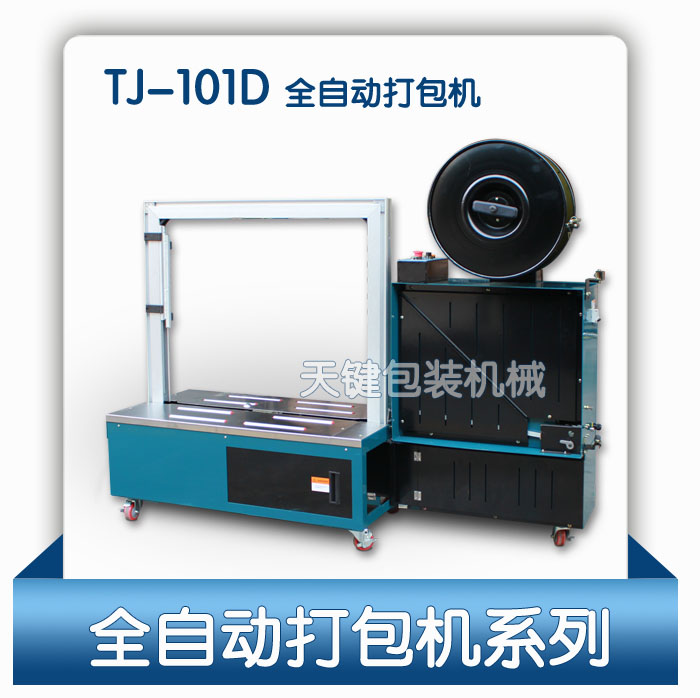 广东天键牌卫浴电器纸箱包装全自动PP带捆扎机101D,捆扎机广泛适用于卫浴电器等企业外箱打包使用。单机操作,无需人手插带,大大提高生产效率。低台型设计,适合重货或大纸箱捆带需求。升级铝合金框架,送带更顺畅。需配合全自动机打PP带使用。广东天键包装厂家直销全自动打包机,自设计生产安装维护打包机一体化服务。全自动打包机升级优质铝合金框架,设备采用知名电气配置,PC控制打包,高/低台全自动打包机,自动送带捆扎打包,无需人手插带,可点动,脚踏,连打等多种打带捆扎方式,打包更灵活,捆扎更高效。全自动打包机可单机使用亦可非标定制简易型封箱打包一体机。天键打包机均可按客户纸箱要求定做。 全自动打包机具体参数如下: TJ-101D全自动打包机 1. 机械尺寸:W1900*D600*H1340MM 2. 重 量:280kgs 3. 适用带宽:9,10,12,16mm(择一使用) 4. 电 源:0.85KVA 3ph,380v,50HZ 5. 捆包速度:2.3sec/min.acyle 6. 弓架尺寸:W850 * H600 mm 7. 捆 紧 力:5-80kg 8. 台面高度:450mm(可调) 9. 捆扎形式:平行1~多道,有手动,自动连打,球开关,脚踏开关