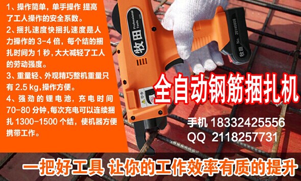 登陆惠扫商城),了解更多详情 1.操作简单,单手操作,提高了工人操作的安全系数; 2.捆扎速度快。捆扎速度是人力操作的3-4倍。减轻了工人的劳动强度; 3.重量轻,外观精巧。整机重量只有2.5kg,操作方便; 4.强劲的锂电池,充电时间70-80分钟,机器方便携带工作。