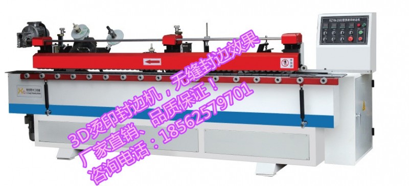 全自动热转印封边机价格 本机特点及功能: 本机适用于强化木门、强化拼接木门、免漆门、生态门、木塑门、家具、衣柜板、橱柜门板的封边。 本机配有铣刀成型、上下修R刀、自动跟踪调整、砂带式砂光、除尘、预热、一次烫印、二次压印、冷却脱模,从而使产品颜色一致,手感光滑,完美无缺。 本机既可单独完成热转印,又可在PVC封边后完成热转印。 本机经不断研发改进,增加预热功能解决了冬季封膜不牢固问题。 钢制道轨经调质处理,更加精确。 技术参数: 工作电压:380V 工作电流:50Hz 板材厚度:12-50mm 工作气压力:3kg 送料速度:6-9/m/min 总功率:10kw 外形尺寸:4100*1120*1300mm