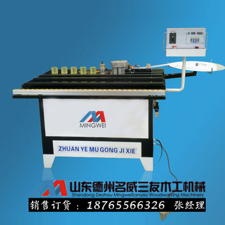 木工封边机采用自动控制,封边作业范围大,可保证热熔胶不糊不漏,适用于各种板材的直曲线封边,体积小,重量轻。适合各家具、橱柜、衣柜、办公家具厂使用等。 使用范围:手动封边机采用国外先进技术,结构为先进的下置式胶盒,此结构用胶轴带胶,涂胶均匀,可以选择板材与封带双面涂胶,手工送料。可对板材侧面曲线、直线封边。用于家具加工,橱柜加工,室内装饰板封边等诸多方面,价格低廉,应用广泛。(可定做U型封边条封边机!) 【封边机特点】 1.双面涂胶功能、自动送带、自动断带,大大提高工作效率。 2.特殊胶罐保温设计; 容量加大且预热时间短。 3.封边带的适用宽度范围增加至8mm-50 mm 。 4.温控器:根据封边带及热溶胶所需的溶胶温度,自动控制温度。 5.调速器:根据不同涂胶和压带需要调整机器速度。 6.所有电器和气动元件均达到UL及CSA标准,整机已通过CE检测认证。 7.胶轴固定架为铸钢材质,铸钢材质在遇热及振动时更加稳固不变形,胶轴及主传动轴均由固定架上下两支点固定,且成三角形设计,结构更加稳定,坚固耐用。