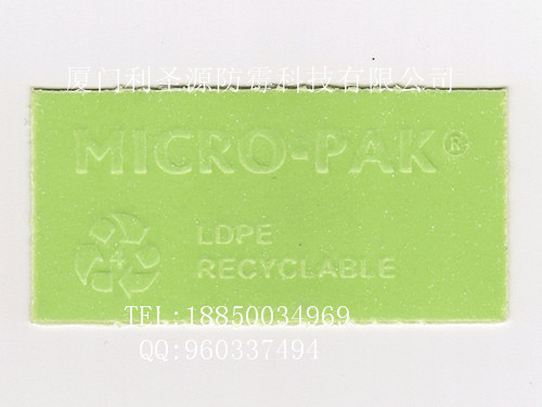 我厂生产供应:霉必清防霉片,MICRO-PAK防霉片,迈可达防霉片,Microgarde防霉片,绿色防霉片,蓝色防霉片,迈科达防霉片,厦门MICRO-PAK防霉片,广东MICRO-PAK防霉片,霉必清防霉片不含DMF,能有效消灭鞋类产品中的细菌和霉菌,而且环保。不含DMF霉必清防霉片(MICRO-PAK)系列产品采用缓释技术,穿透性超强,藉以穿透破坏霉菌孢子,使其无法滋长。具有二氧化氯和植物精油两种先进的防霉方式,让防霉因子持续作用,能有效抑制霉菌、蓝绿菌、大肠菌、真菌、病毒、藻类、芽孢、异养菌等,杀灭霉菌,效果显着,环保高效。 当空气中的湿度高或湿气大。湿气就会进入霉必清环保不含DMF防霉片MICRO-PAK中,引发固态干反应,产生二氧化氯,抑制微生物的污染,并控制气味的产生。 霉必清防霉片(MICRO-PAK)完全符合美国食品药物管理局之规范FDA21CF175.300和欧盟食品级规范EuropeanUnion2002/72/EC/(90/128/EEC)以及美国试验与材料学会d4576-86(1996批准)的抵抗霉菌测试标准,提供的防霉抗菌剂也完全符合美国试验与材料学会d4576-86(1996批准)的抵抗霉菌检测标准。 一、规格:2.5cm*5cm 包装:2000片/1包,10包/箱。 二、霉必清防霉片(MICRO-PAK)的优点: 1.不受温度、湿度影响,释放灭菌气体,有效对抗霉菌。 2.对正确使用者安全无害。 3.绝无任何污染存在,不会损害环境、减少废物及垃圾。 4.根据周围的温度及湿度调节释放份量,并可持续六个月以上。 5.只需轻轻接触,便可发挥抗霉功能。 6.消除臭味,保持产品气味清新。 7.安全环保,在泥土中二个月可以完全降解。 霉必清防霉片(MICRO-PAK)在任何环境中,包括原料、鞋盒、纸箱、货柜、均能有效消灭霉菌,无论是在工厂内,抑或离开了货仓,功效仍然