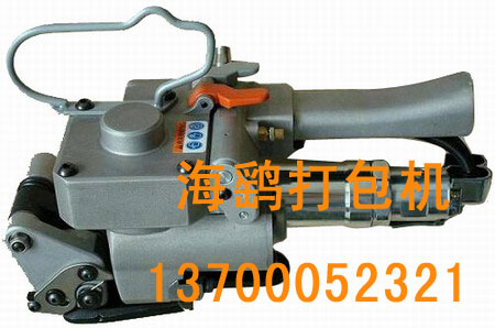 气动打包机(PET塑钢带) 型号QT-19(CMV-19) 产品介绍: 1、使用方便、机重轻巧、气动大功率设计。 2、无需扣件,采用摩擦热熔接,接口美观可靠。 3、束紧、黏结、切断一次性完成,操作简便。 4、机器耐用度高,所有机体和构件均采用高强度合金材料、高可靠度、先进的工艺制造。 5、大束紧力,特殊结构设计,轻松实现如钢材、铝锭、重型包装物的束紧和打包。 用途范围:气动打包机广泛应用于化工、金属制品、铝业、钢材、木材、木箱包装、纸业、化纤、棉纺、烟草等行业 技术参数: 适合带种:PP、PET带通用 封带形式:摩擦热熔接 适用带宽:13-19 mm 适用带厚:0.5 -1.2 mm 粘接强度:75% 大束紧力:2800 N 适用气压:0.5-0.8 MPa 机器重量:3.8Kg 外形尺寸:280×160×180 mm